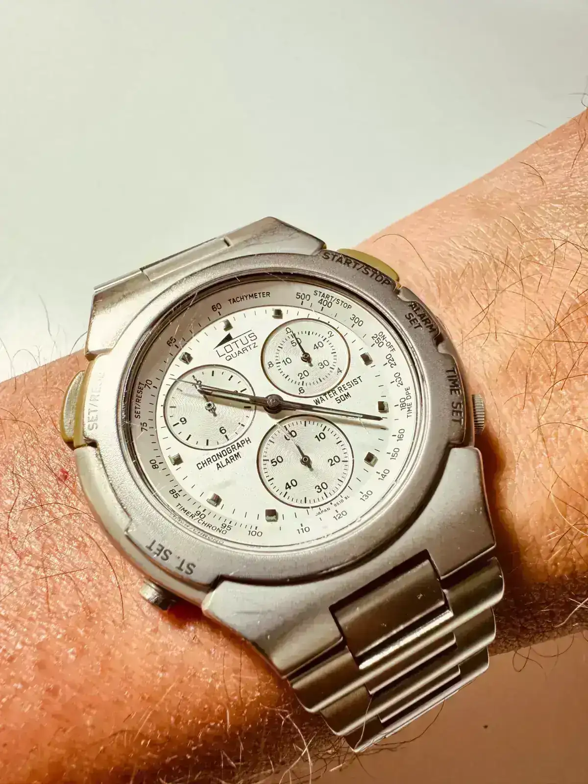 Sí compañero, el famoso Miyota 3S10, en este caso la variante 3S31 sin calendario, de los mejores calibres cronógrafo de cuarzo, con crono de 12 horas a 1/50 de seg, y además con cuenta atrás y alarma. Un calibre de mucha calidad, con cosas que los detractores de los relojes de cuarzo ni se imaginan, como que tiene rueda de pilares y está montado sobre rubís, y además tecnológicamente adelantado en su tiempo. Además tienes uno con una caja muy poco vista, muy bonito.Lotus crono, una joya de calibre, tal y como presenta el compañero @Charlino.