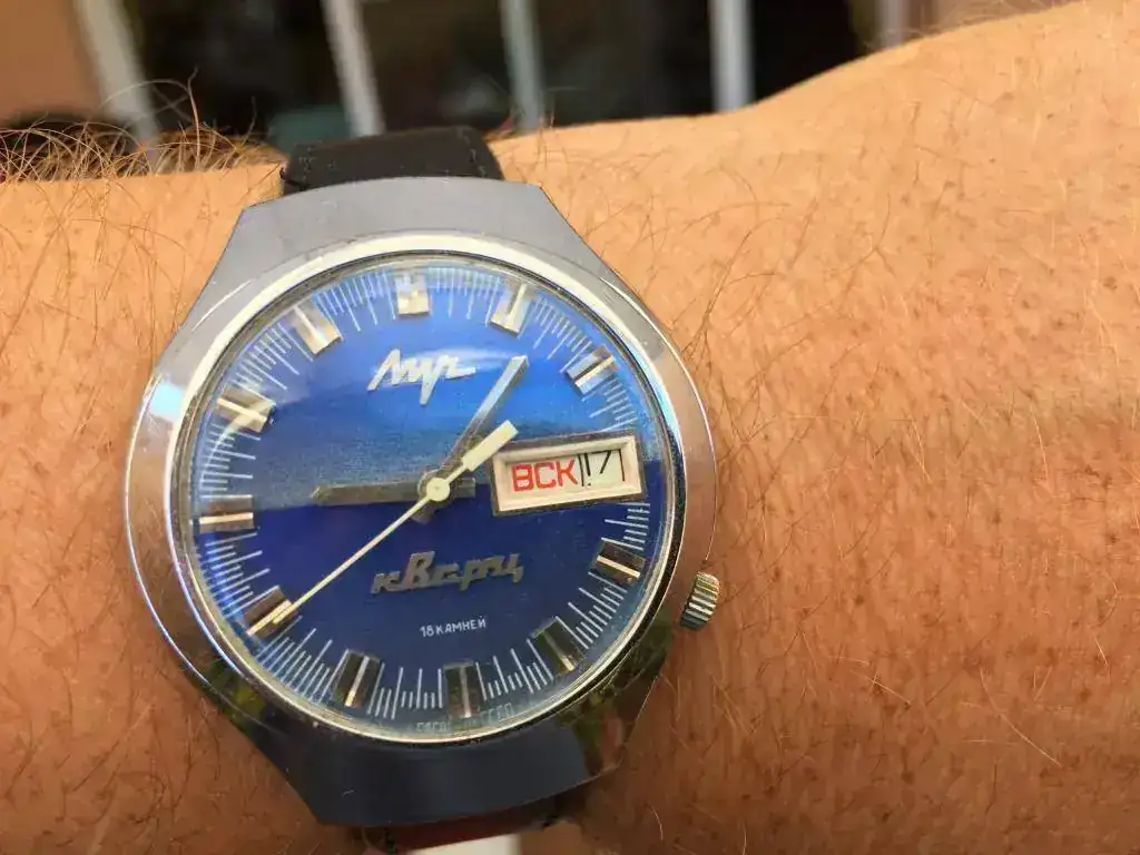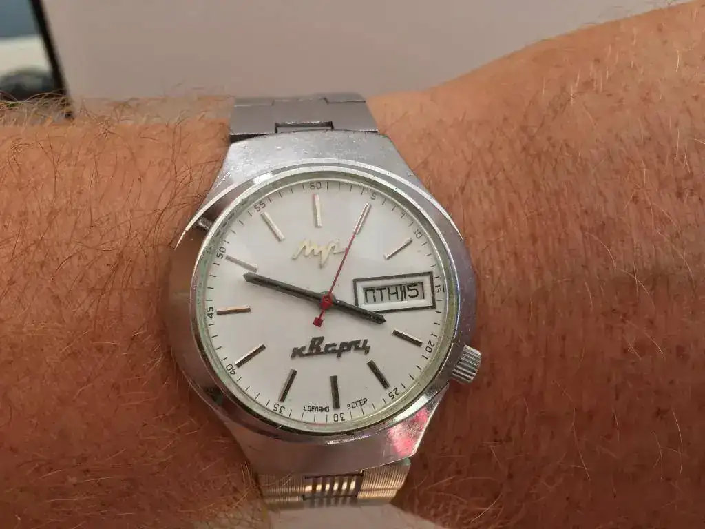Chaika 3050, 11 rubies, cambio de fecha instantáneo, El primer reloj de cuarzo, construido en la Unión Soviética, 0s de desviación en tres meses, 40 años a sus esoaldas; sin duda el reloj más exacto que tengo: