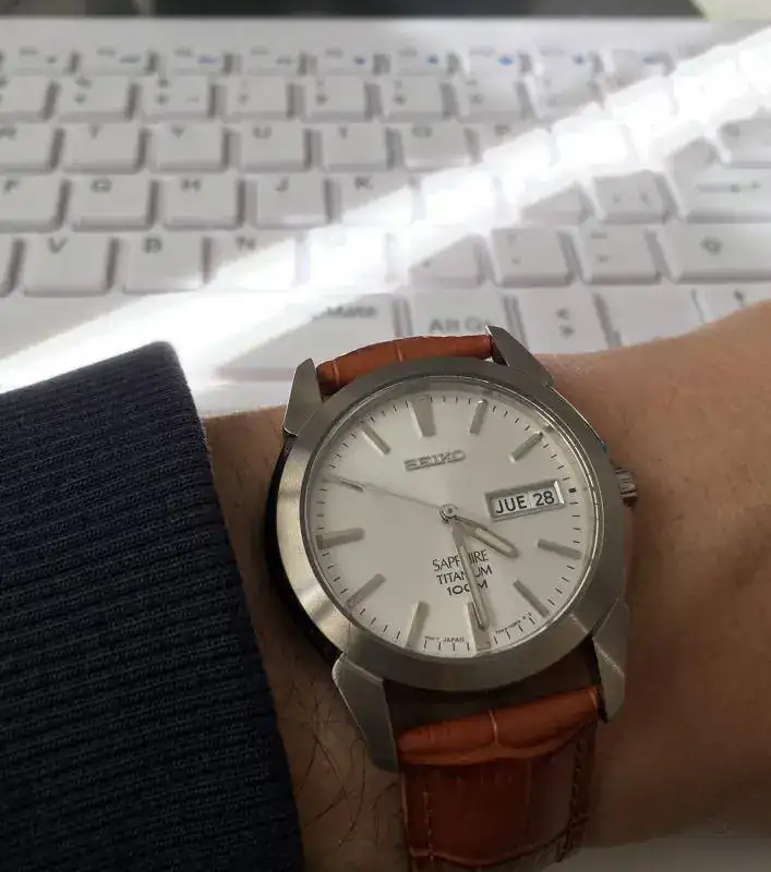 Mientras minimizo la colección hasta extremos insospechados, estoy trasteando con este Seiko Quartz. 37mm, zafiro, titanio y 100m, y parece ser muy preciso.