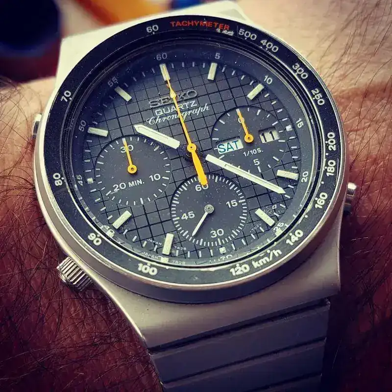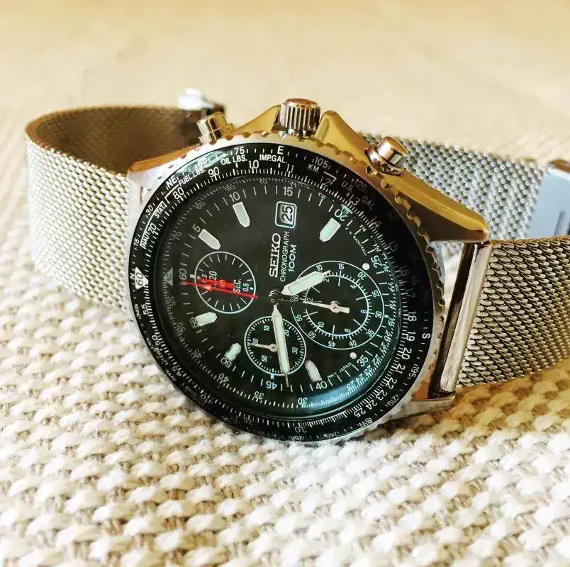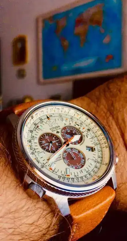 Es un crono un poco "poco ortodoxo" ya que la aguja segundera grande es la del reloj y las dos subesferas son las del crono. La tercera subesfera es un marcador 24 horas, para saber si es a.m. o p.m.