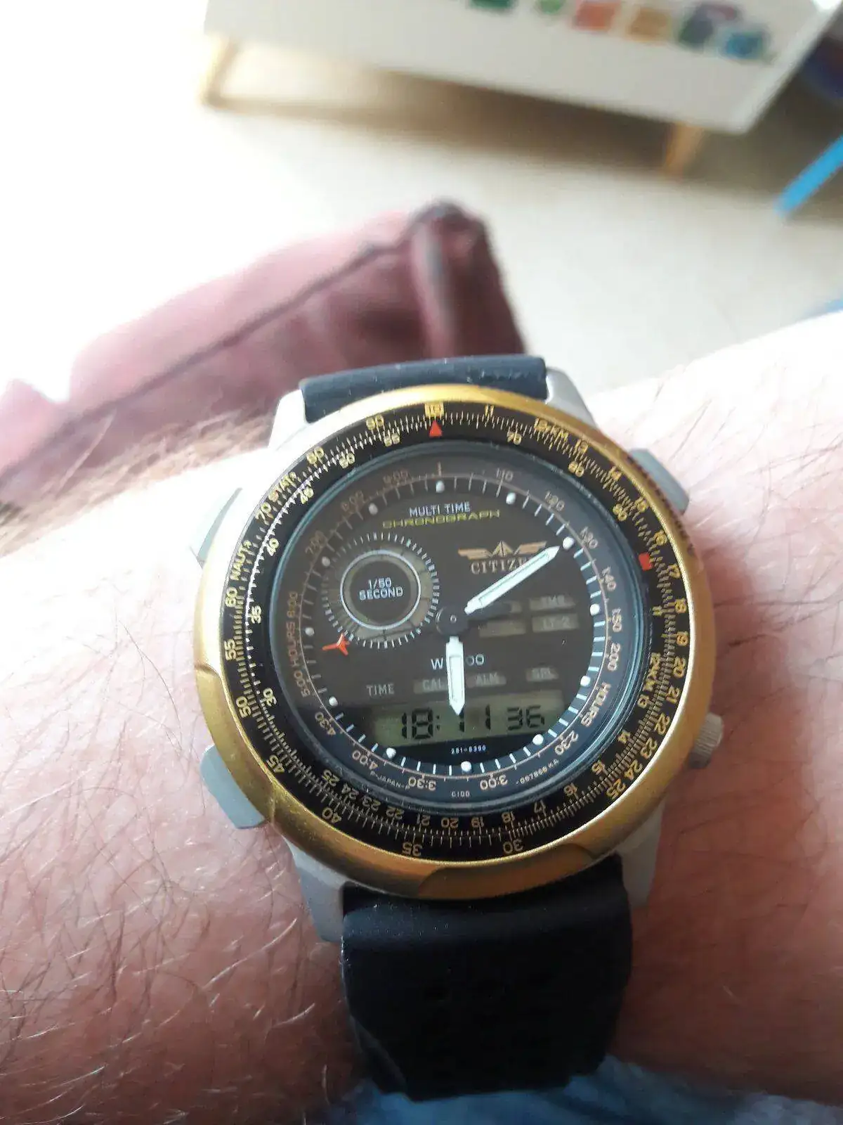 Precioso, David!!, hasta la punta de la segundera está genial, en forma de avión!. Toda una pieza, gran caza!!Buenas tardes. Hoy como le prometí a mi amigo @pinon os presento este Citizen multi time de los 90 NOS. Ver el archivos adjunto 1194268
