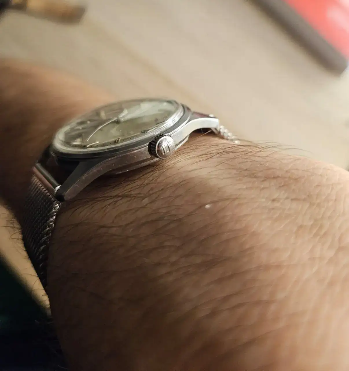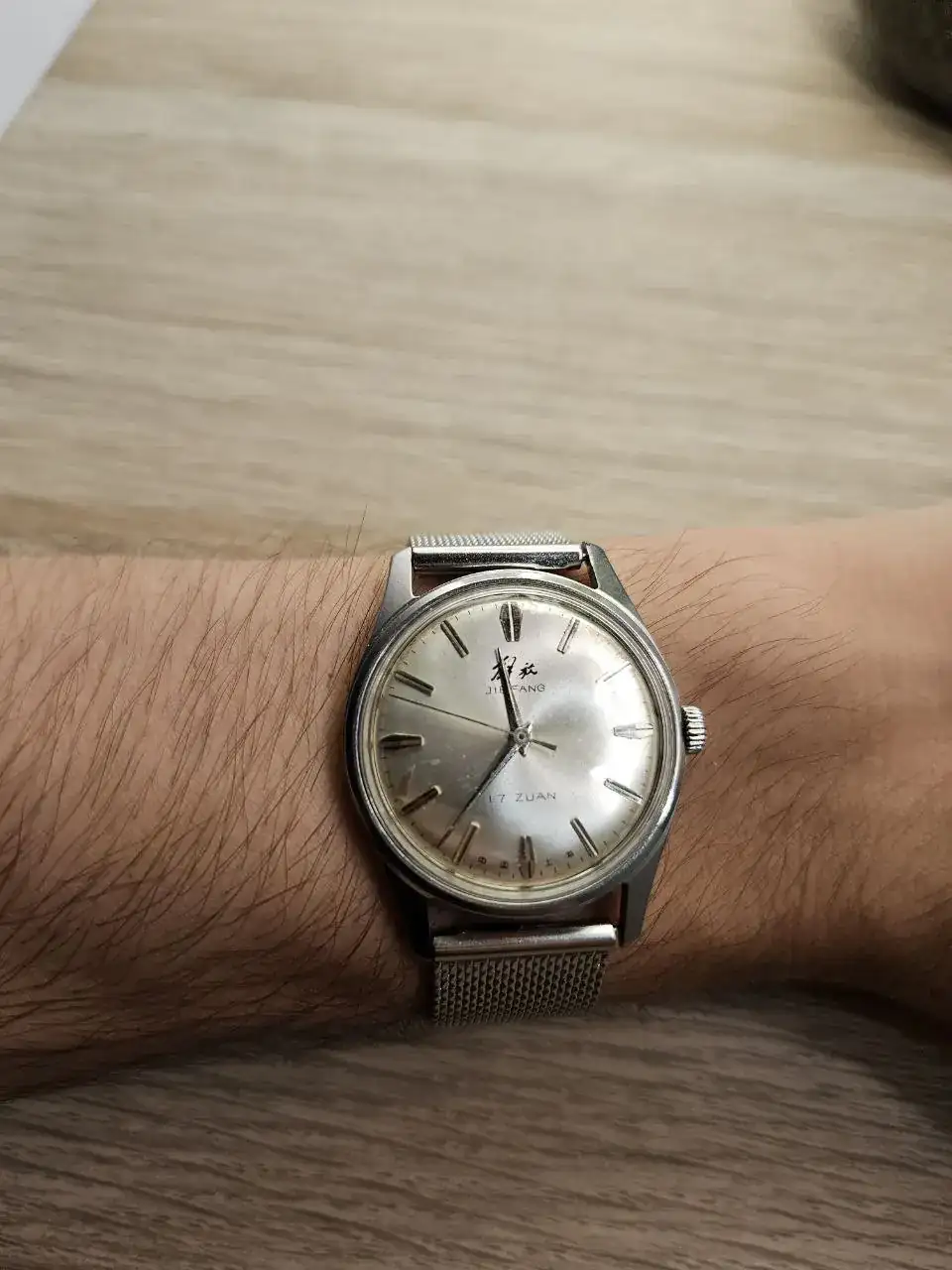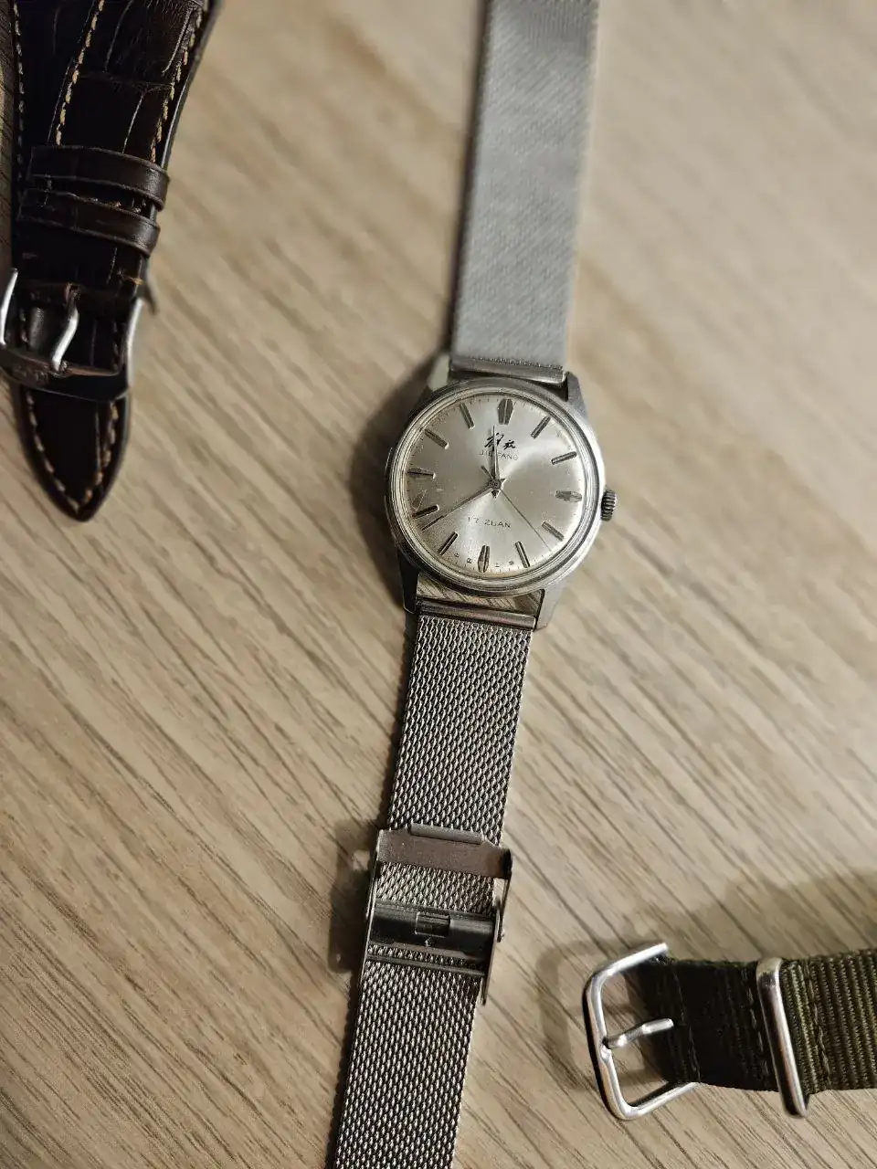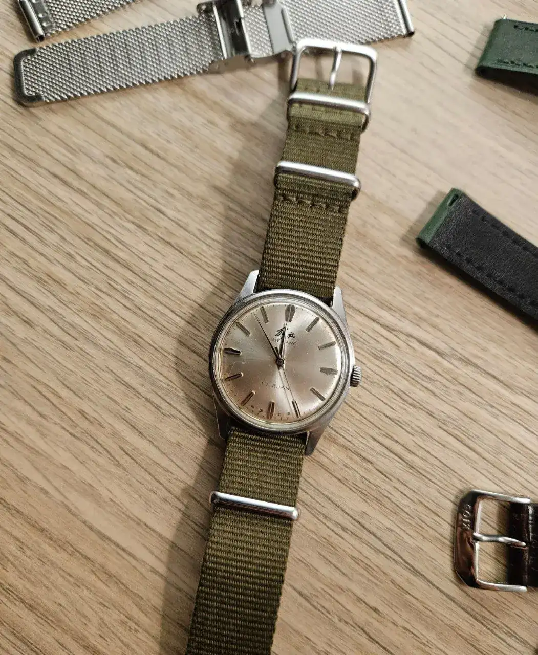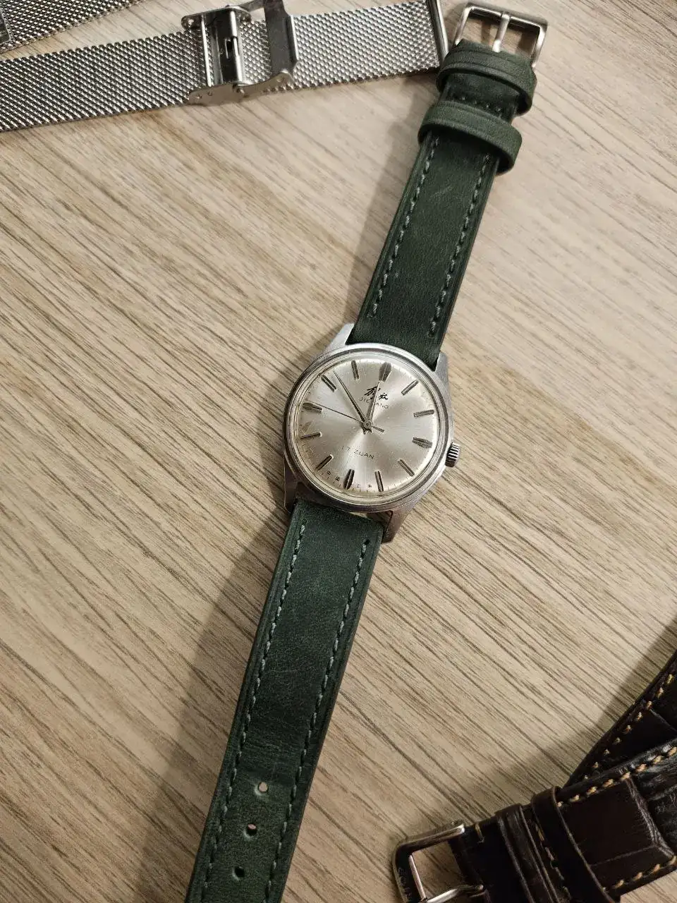 Os presento aquí mi pequeño lujo de este verano, un Chino Vintage Jiefang, mi primer contacto con la relojería china. Con un diámetro perfecto para mis muñequitas de niño, 35mm, estoy más que contento con él. Guardando su aspecto inequivocamente vintage, no se hace demasiado viejo a la vista ya que está en muy buen estado, más allá de alguna mancha en la esfera. En cuanto a la precisión del reloj, no he hecho ninguna prueba con herramientas, pero usándolo a diario no parece que vaya especialmente adelantado o atrasado. Me parece un reloj de vestir precioso, que con un simple cambio de pantalones tiene casi personalidad múltiple. He probado varias correas, alguna comprada especialmente para este Jiefang, y me parece que las mejores son estas: