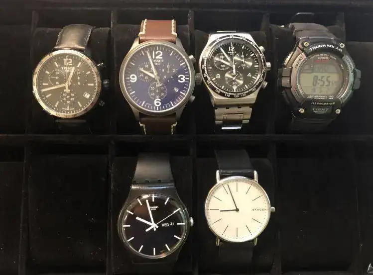 Para que vuestra ayuda sea más útil, os doy una pincelada de mi situación con los relojes: comencé a llevar reloj hace un par de años, y desde entonces he ampliado mi relojero con la finalidad de tener relojes que se adecuen a distintos tipos de ocasión y de vestuario (ver foto).