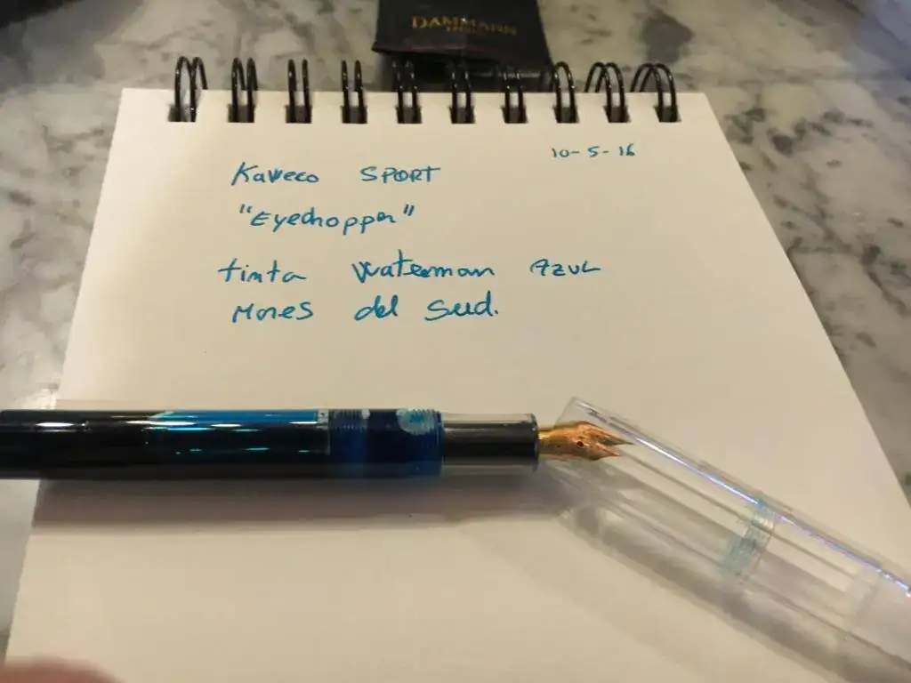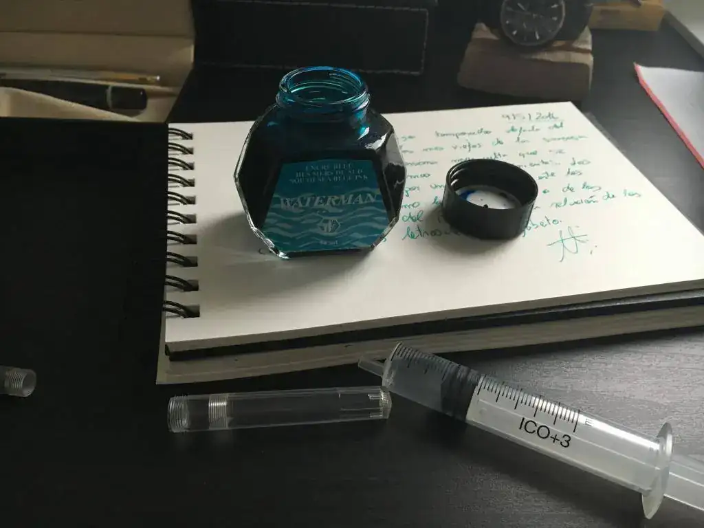 La tinta utilizada es la archiconocida Waterman Azul Mares del Sud, aunque creo que ahora han cambiado el nombre.