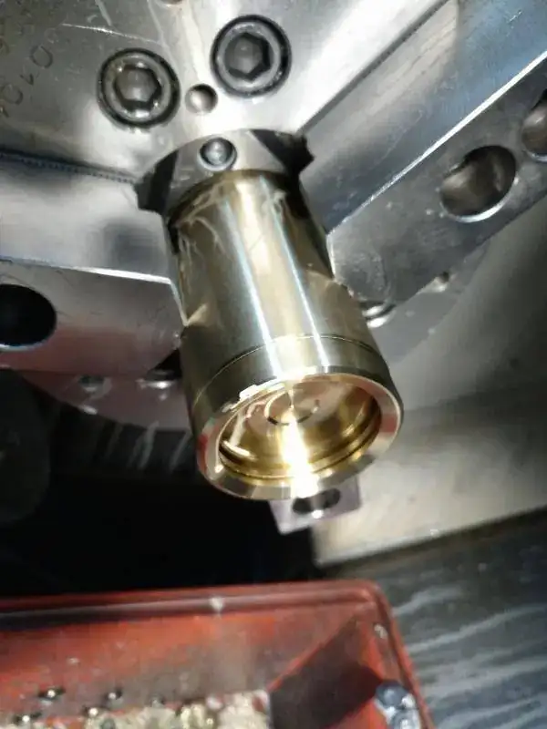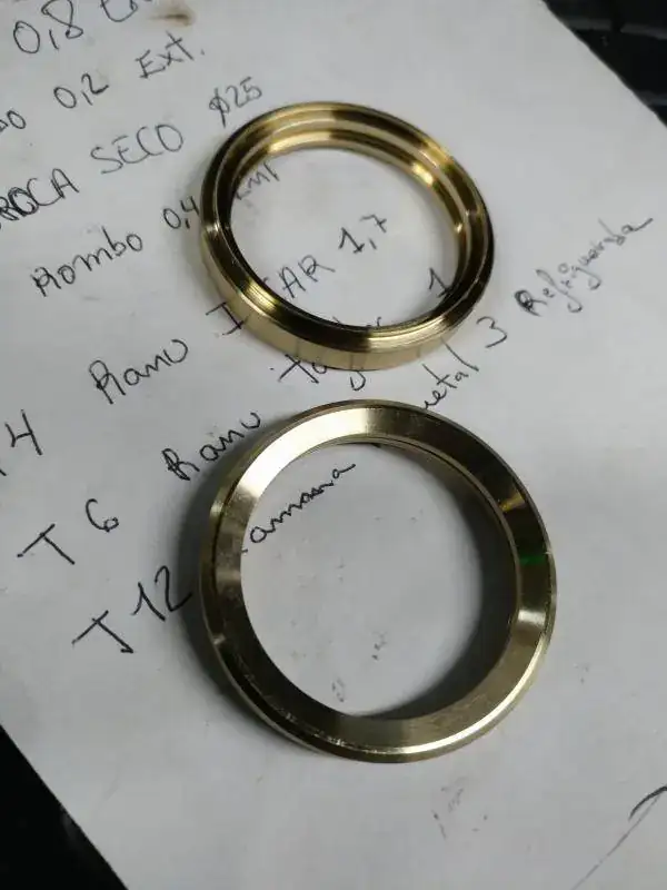 Bueno, ya tenemos algo un poco más concreto que enseñaros; la primera fase de mecanizado de los biseles en torno. La segunda fase será con la fresadora para hacer el dentado perimetral y el dentado para el muelle (para el giro del bisel). A mi personalmente el color de este broce me encanta, con los acabados puede quedar espectacular. En la primera foto se ve la pieza colocada en el torno, la cara vista es la parte superior del bisel. En la segunda foto lo vemos también por la parte de contacto con la caja.