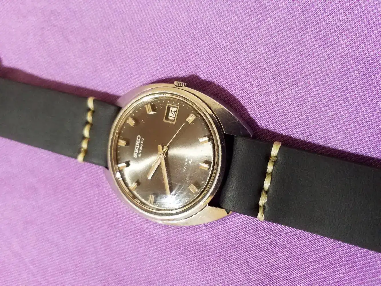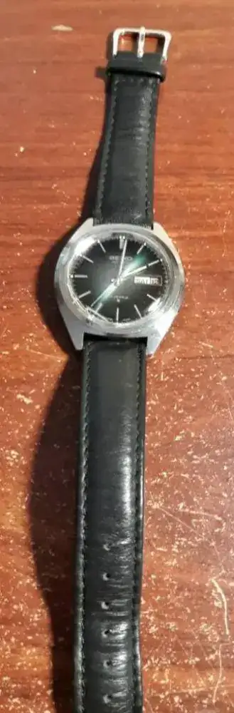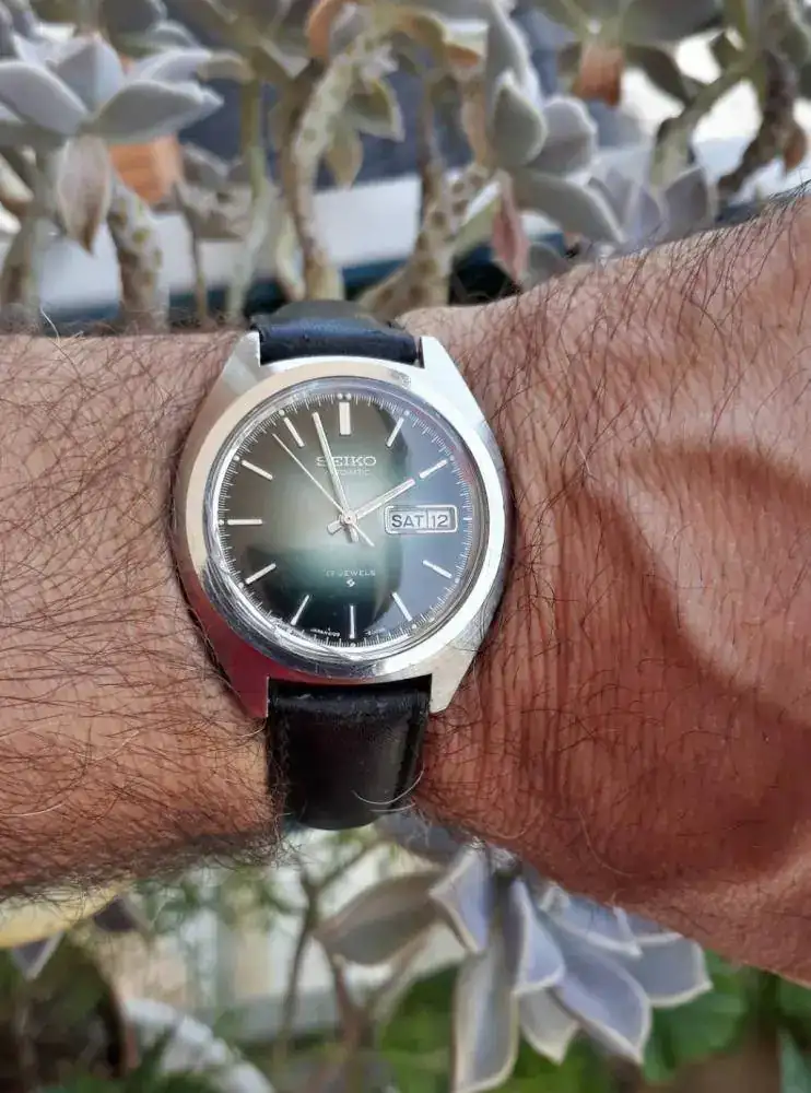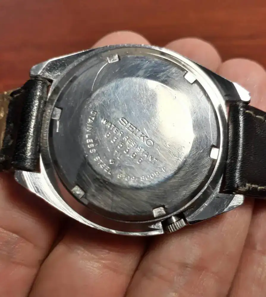 Hola amigos feliz sábado,hoy les comparto el Seiko movimiento 6109-8009p del '76 probando una vieja correa de piel negra.plexi dañado. Restauración propia