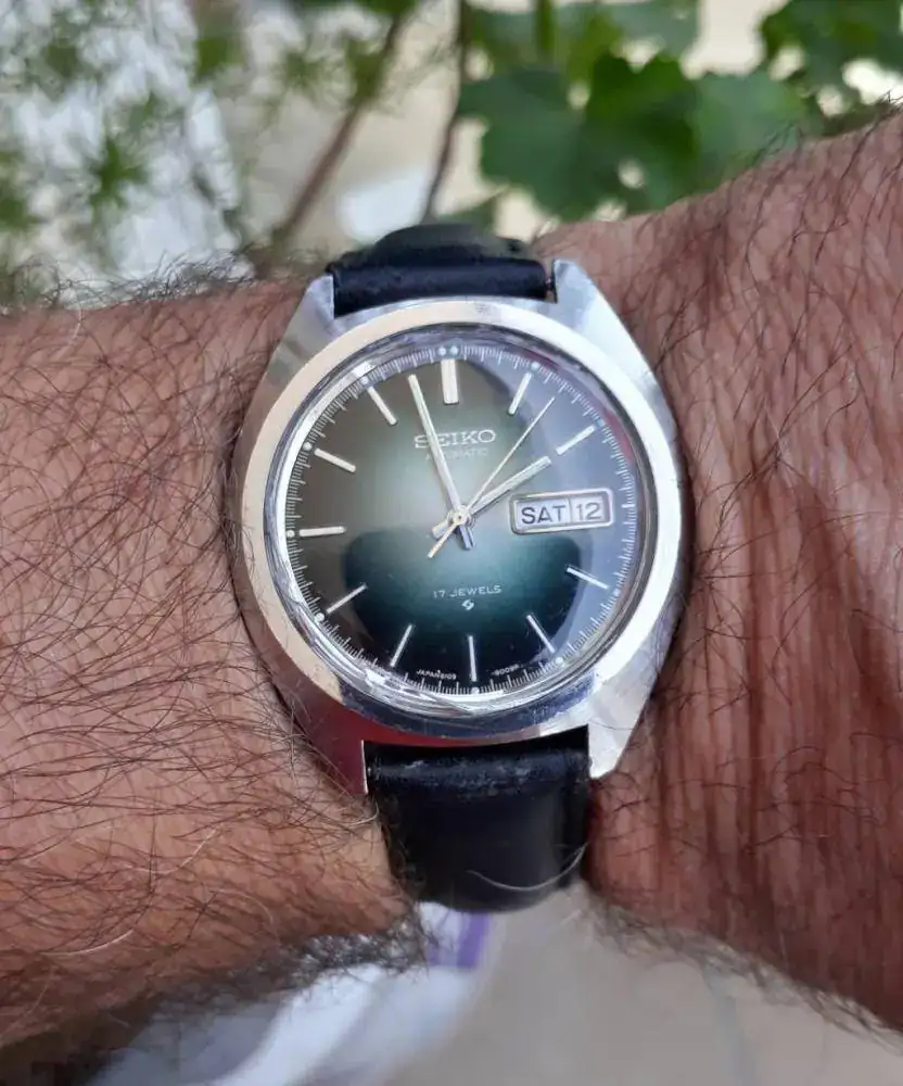 Muchas gracias,a esta pieza la tengo un poco abandonada,ya que en febrero de este año cuando lo compre lo puse en marcha,limpieza de maquina,pulida muy suave cambie plexi nuevo ,después de un mes con un golpe contra otro reloj se rompió nuevamente el plexi,donde vivo no es fácil y económico conseguirlo,por eso esta aun dañado,coloque un brazalete de acero,pero la verdad a estos Seiko's que no son "5" les va mejor las correas de piel,creo voy a buscar una correa de piel marrón oscuro para ver como le sienta con el dial verde de contraste.