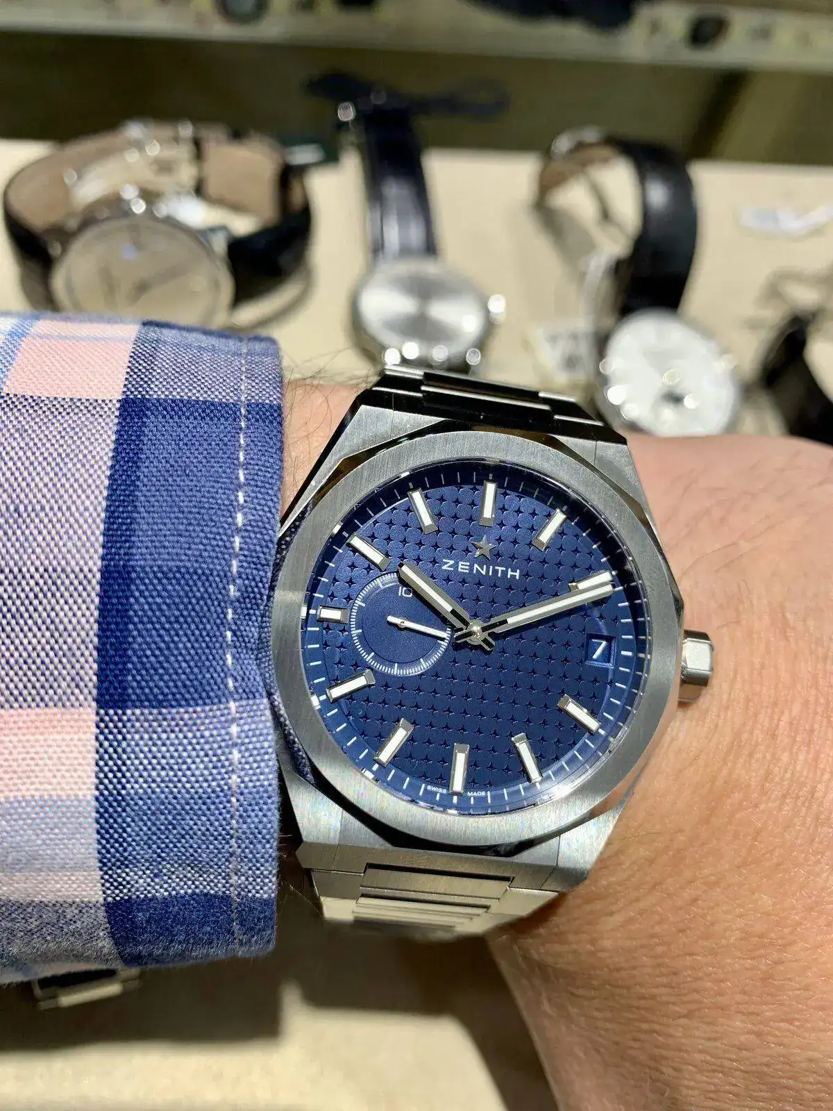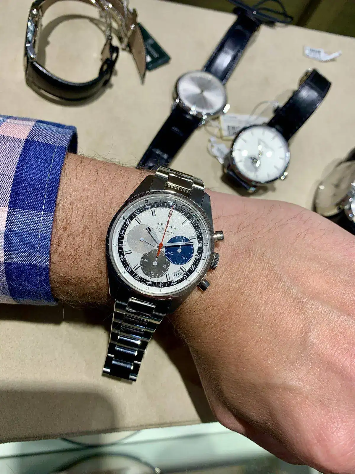 Ayer tuve opción de dedicar parte de la mañana a ver y probar diversas piezas en las que estoy interesado. Por un lado, busco un reloj para regalar a mi padre por su jubilación (será su primer automático) y por otro busco uno para mi (entre mis preferencias, el Moonwatch y el Zenith Chronomaster).