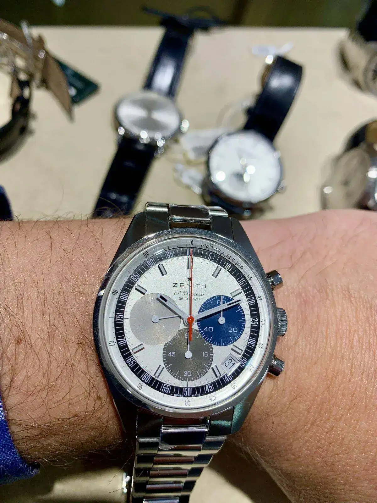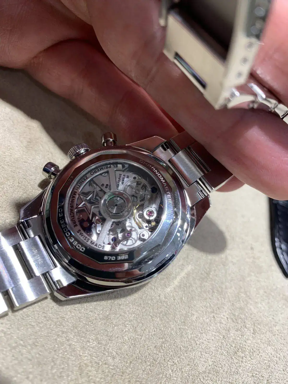 Pues bien, estuve en un distribuidor oficial Zenith (entre otras grandes marcas) y pude probarme el Chronomaster Original con armis. La verdad que el reloj es una pasada, es precioso, esa esfera con las subesferas tricolor… y por supuesto la trasera. Estética y técnicamente es un relojazo.