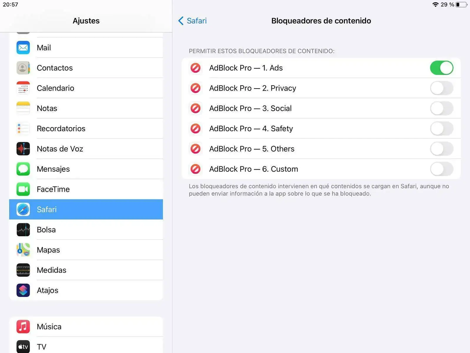 Una vez descargada, volviendo a Ajustes>Safari>Bloqueadores de contenido: salen varias opciones... yo he marcado la primera: ads: