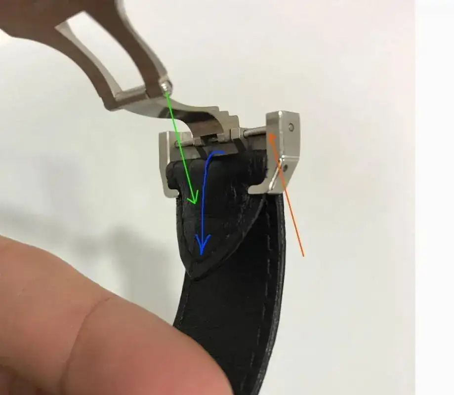 El truco es separar la zona doblada de la correa del pasador del cierre con el primer movimiento, luego solo es tirar de la punta sujetando la otra parte de la correa para que la correa se doble hacia dentro del cierre.