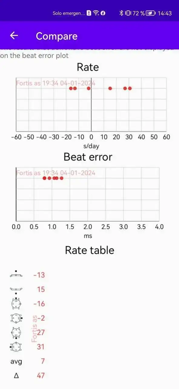 Esta grafica es de el dia que lo recogi,sacada de el video de el umboxing, un pase rapido con el movil, vi que para la edad que tenia estava mejor de lo que esperava y va clavado… por eso te digo que el tema de las graficas depende, tienes que usarlo para verificar que funcione bien o mal, tengo relojes mas nuevos que estan mucho peor… asi que lo mejor no es una app para verificar eñ funcionamiento, es cargarlo a tope ponerlo en hora y en 2 dias verificas.