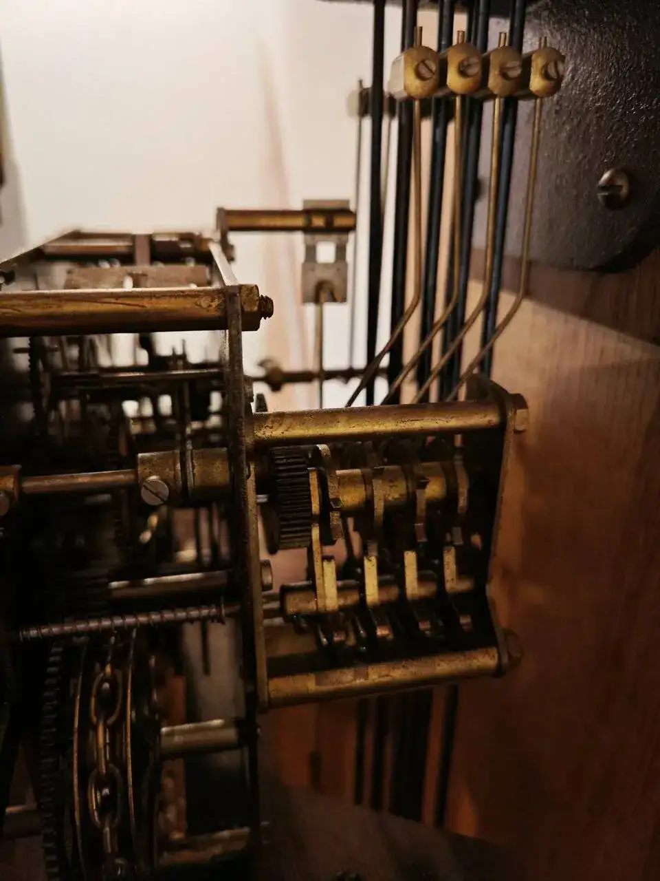He tardado un tiempo en conseguir las cadenas y cuando las puse no funcionaba la sonería, por lo que limpié y engrasé la maquinaria lo mejor que pude (no me atreví a desmontar la esfera porque hay que quitar una placa metálica posterior donde hay engranajes de la fase lunar)
