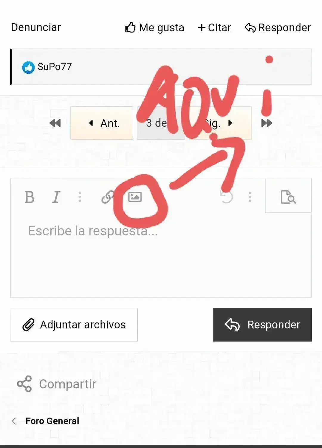 Compi, para insertar las fotos le tienes que dar aquí. Lo otro que haces es adjuntarla y salen al final del mensaje.