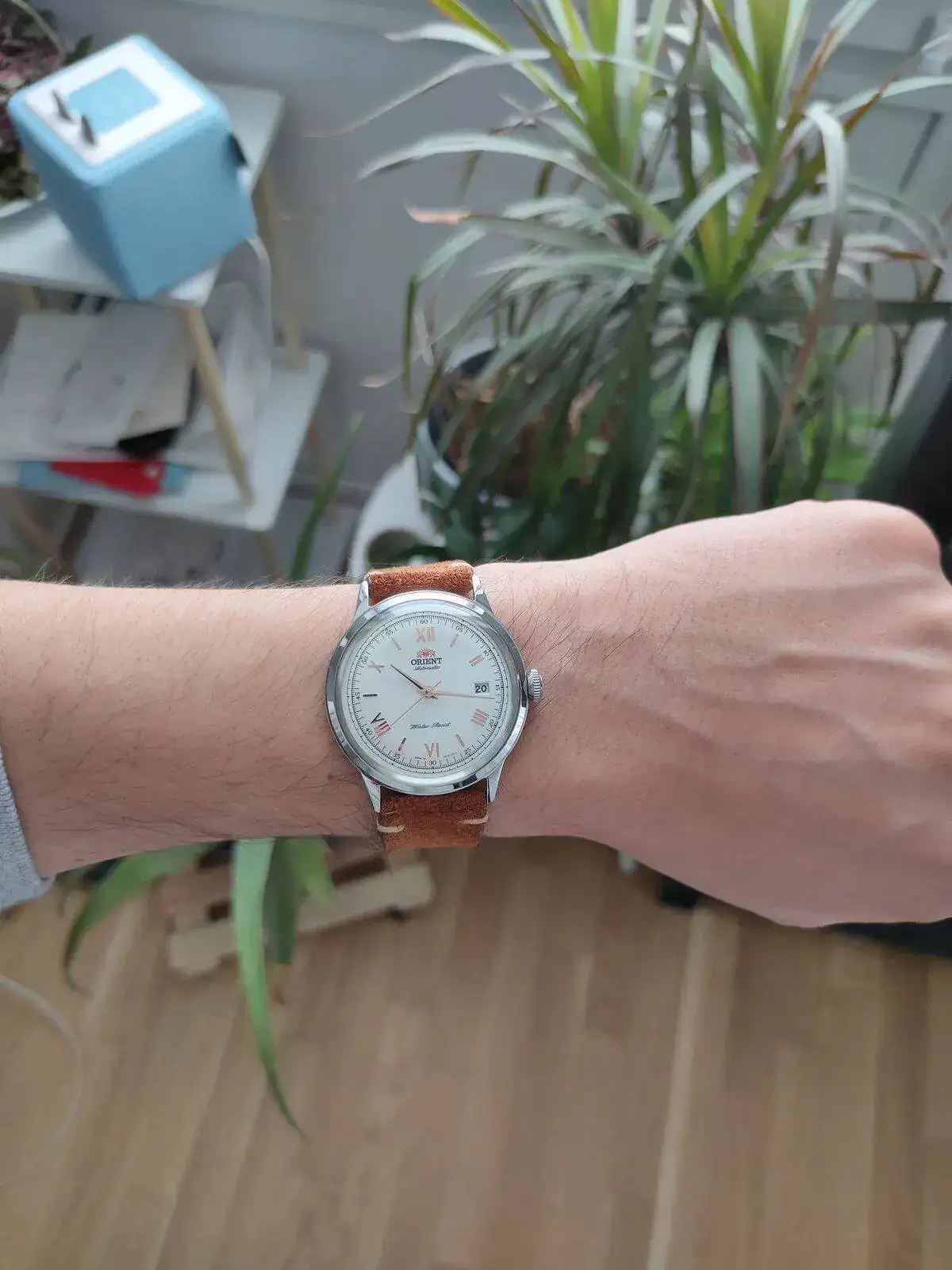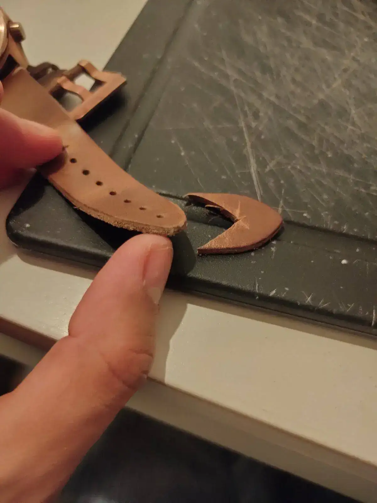 Pues de esto que cogí manía a que las correas siempre asomen la cola porque tengo muñecas pequeñas, así que pillé las tijeras (que tendrían que haber sido mejores, o incluso utilizar un cúter), y le hice la circuncisión a la susodicha, y aprendí a sellar los bordes del cuero con cera de abeja (una chapuza brutal, tengo que mejorar, así que no hago macros), e invertí la hebilla, para que no tenga tanto cabeceo, y aquí los resultados: