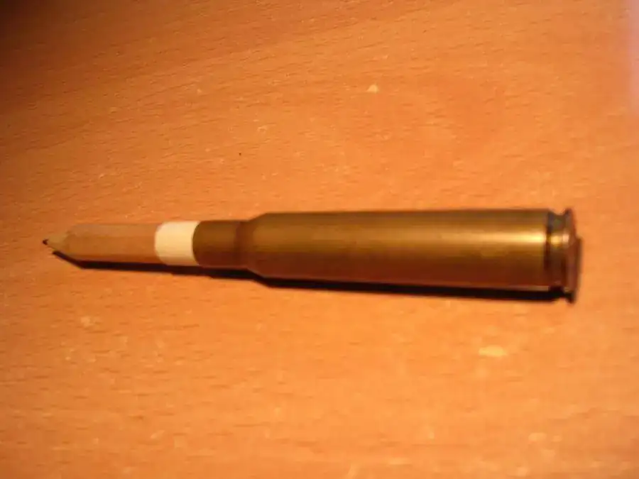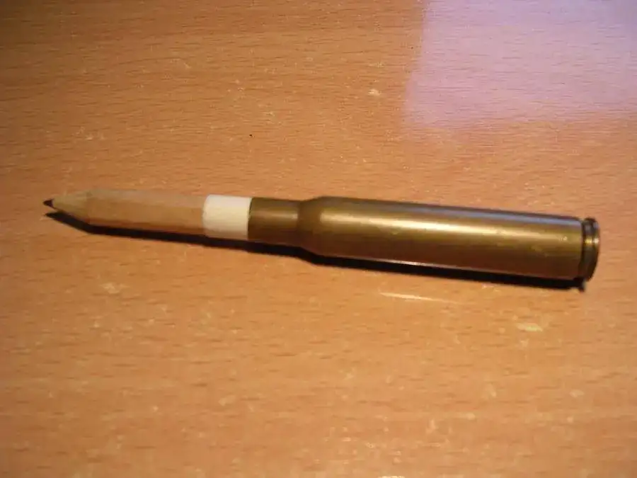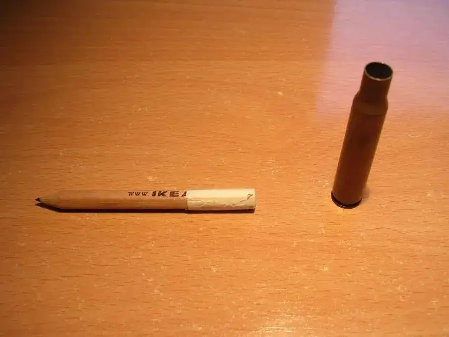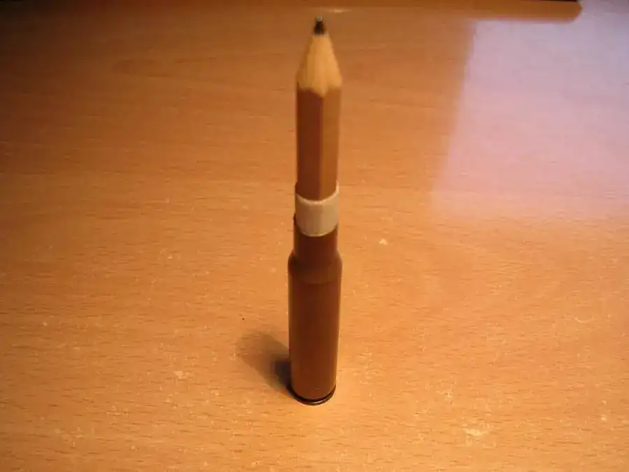 Me da dado luz para esta idea que se me acaba de ocurrir, se trata de un lapicero corto al cual le inserto una vieja vaina metálica de fusil, el lapicéro como tenia un poco de holgura le di unas vueltas de cinta de carrocero, hasta encajar bien, además se sostiene de pie.