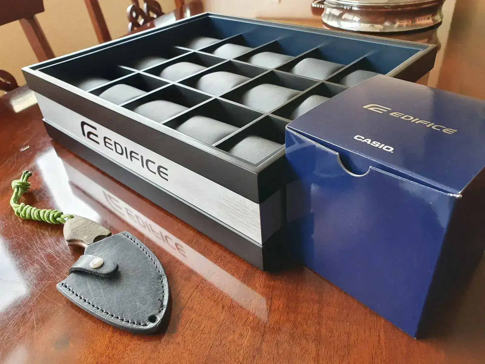 es así de sencillo: con tu compra mínima de 149€ en la tienda online de Casio España junto al reloj se te enviará un relojero con capacidad para 15 relojes en madera lacada y aluminio. Los huecos son verdaderamente generosos, imagino que para dar cabida a bestias como el Mudman, de manera que en ese sentido no vas a tener problemas de espacio.