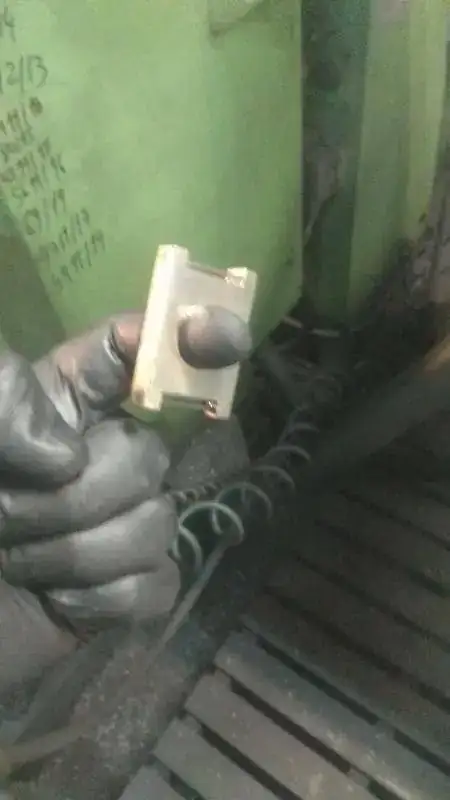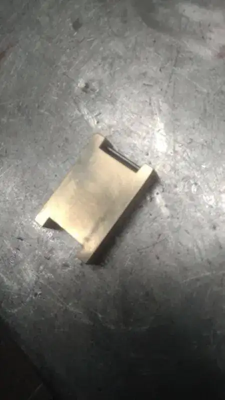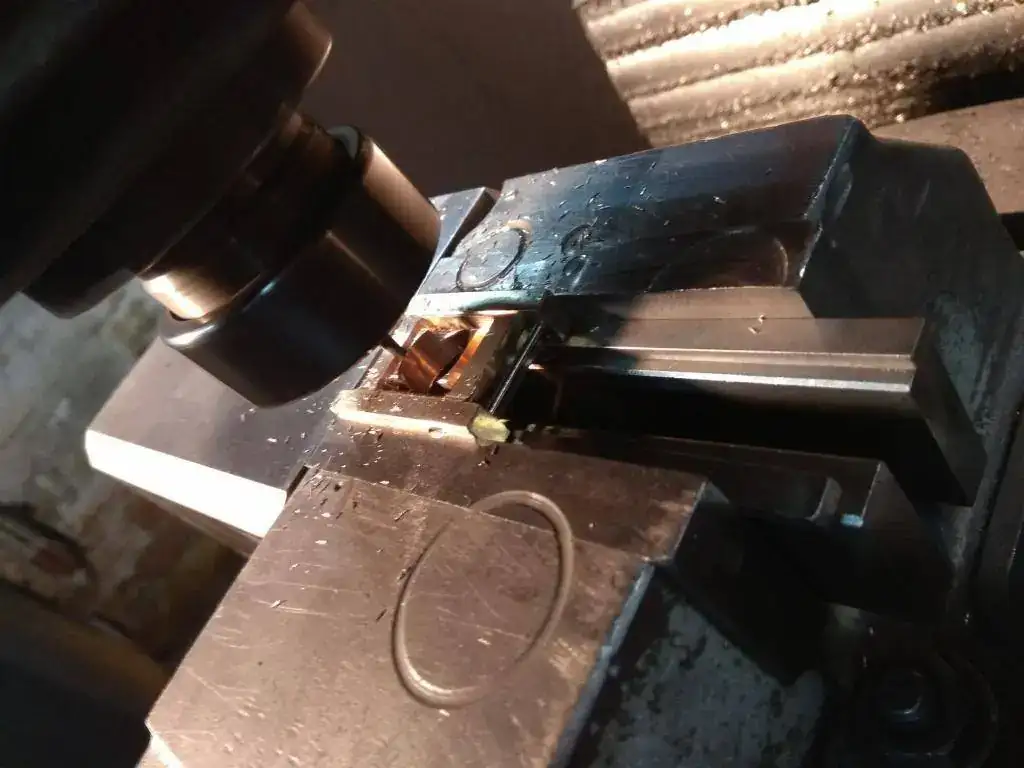 El bloque de bronce pre mecanizado y con una asa ya fijada, luego con un agujero y en la fresa trabajando.