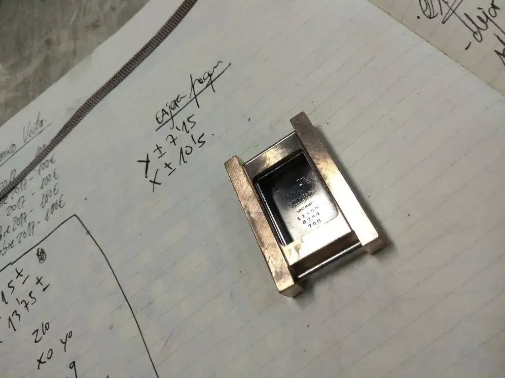 Hoy os quiero mostrar un nuevo prototipo rectangular de bronce. Mecanizado de la caja, esfera y plexi. Bueno y al ser de asa fija también, tuve que coser la correa