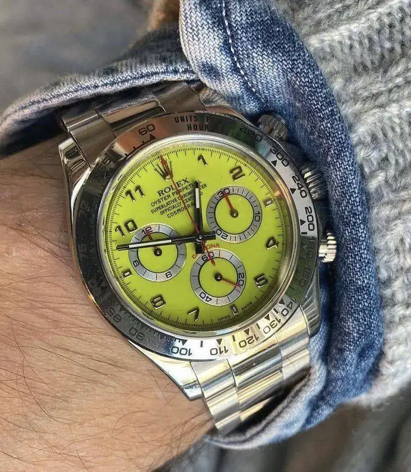 Tienes que pedir disculpas por el dolor que tengo ahora en los ojos. Esto no es un color, es una enfermedad y nunca de Rolex.Navegando por las redes me encontré este reloj que aseguran ser original y prototipo único de daytona…no quiero ni pensar cuanto se podría pagar por él…