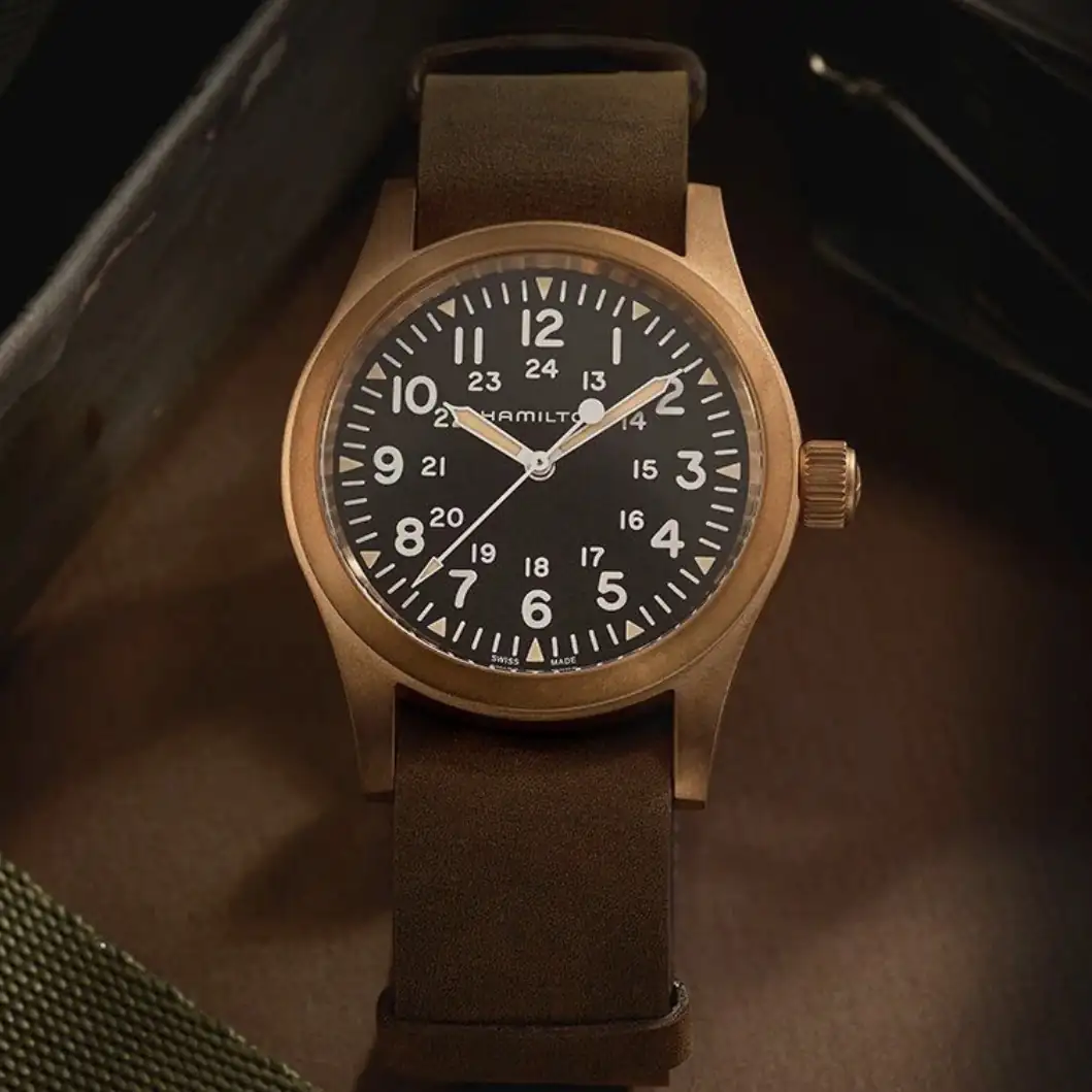 - Caja de bronce con tapa ciega de titanio. Según Hamilton, han utilizado un bronce que ralentiza la aparición de la patina para que se vaya formando lentamente con el uso durante varios años (a diferencia de otros bronces en los que la patina se forma en pocos días).