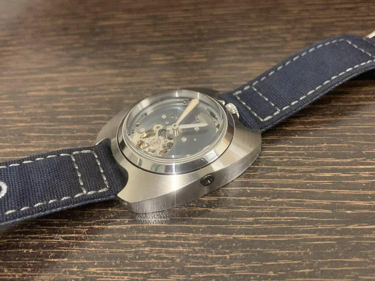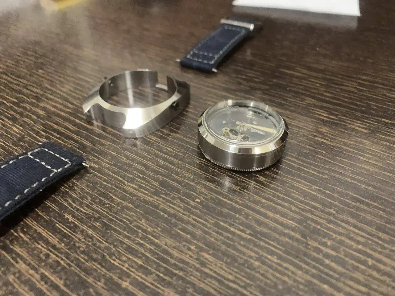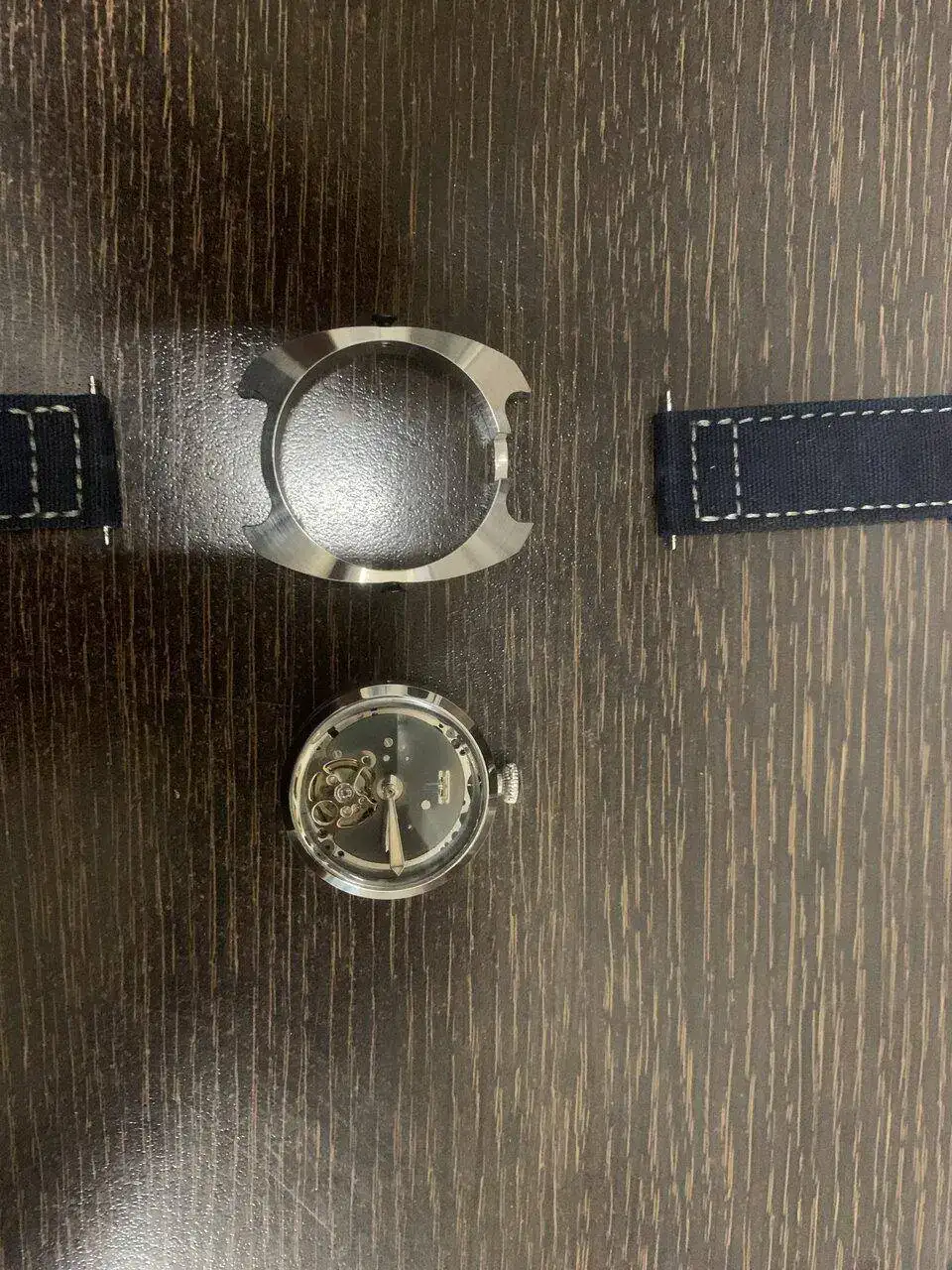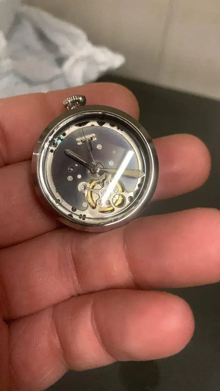 Hoy os presento el último prototipo que he hecho, se trata de un reloj con un módulo y una caja, separados y unidos por dos tornillos, para el módulo interior, aproveché un reloj Baltany con un NH38 y transformé la caja en circular, manteniendo la estanqueidad, al quitarle el dial, me pareció que tenía una esqueletización suficientemente digna como para mostrarla y lo único que le hice fue azular a fuego la pletina que se ve. Con el módulo listo (y con dos colisos para alojar los tornillos) construí la caja exterior de 0. Es de inox también, y buscando una estética de Bethune, salió algo hibrido entre lo que buscaba y una caja de diver vintage (más esta última que la estética de Bethune).