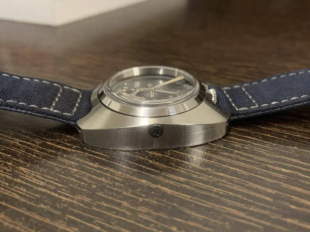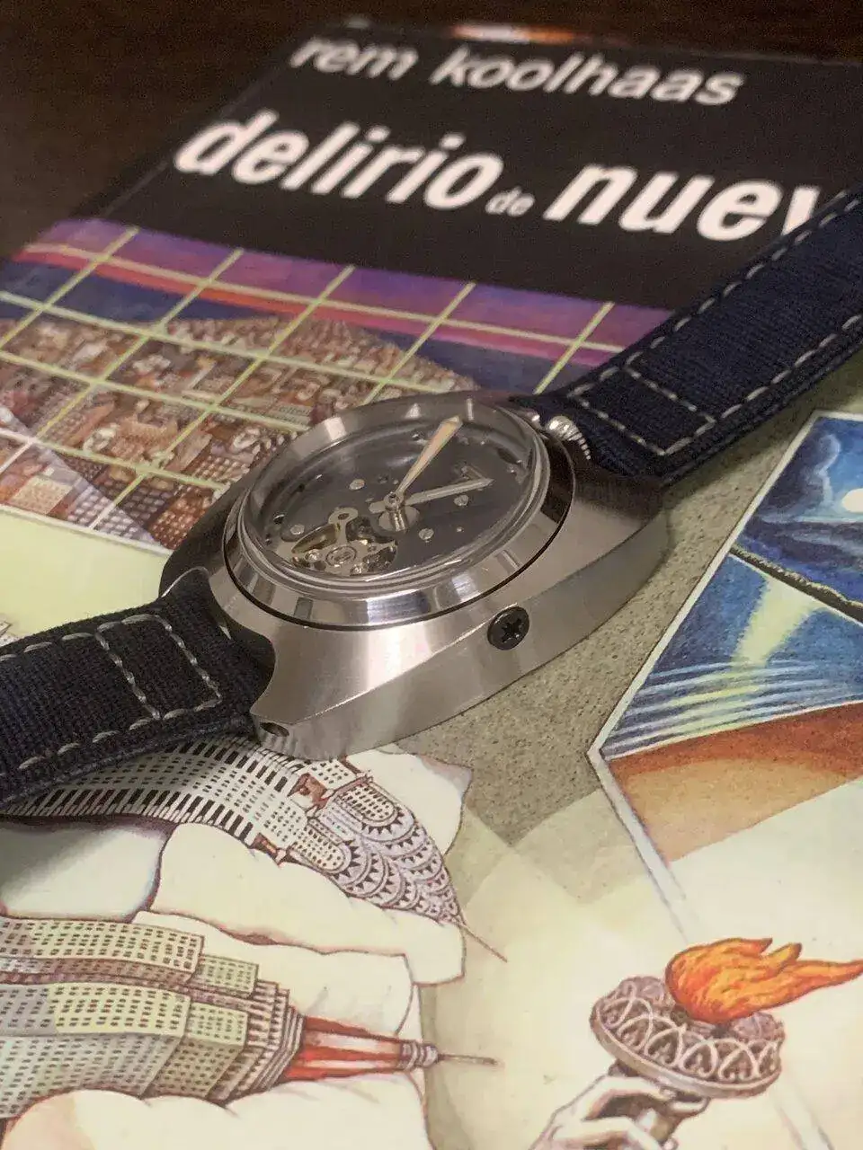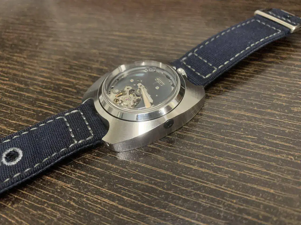 Hoy os presento el último prototipo que he hecho, se trata de un reloj con un módulo y una caja, separados y unidos por dos tornillos, para el módulo interior, aproveché un reloj Baltany con un NH38 y transformé la caja en circular, manteniendo la estanqueidad, al quitarle el dial, me pareció que tenía una esqueletización suficientemente digna como para mostrarla y lo único que le hice fue azular a fuego la pletina que se ve. Con el módulo listo (y con dos colisos para alojar los tornillos) construí la caja exterior de 0. Es de inox también, y buscando una estética de Bethune, salió algo hibrido entre lo que buscaba y una caja de diver vintage (más esta última que la estética de Bethune).