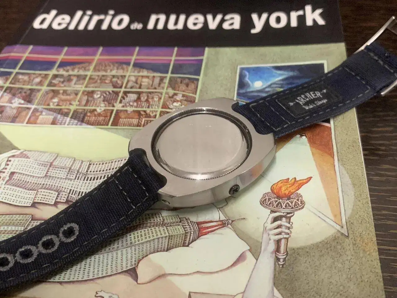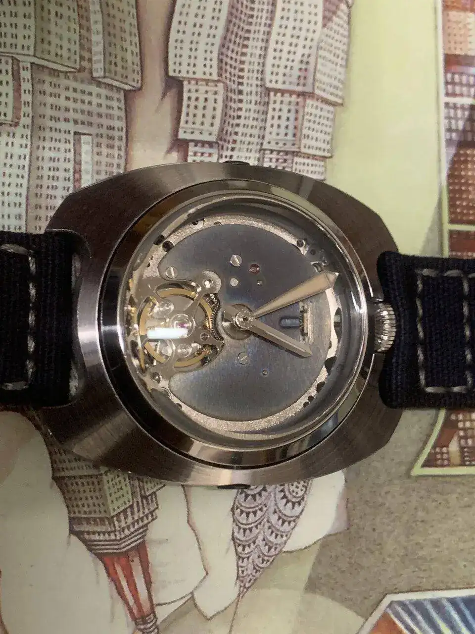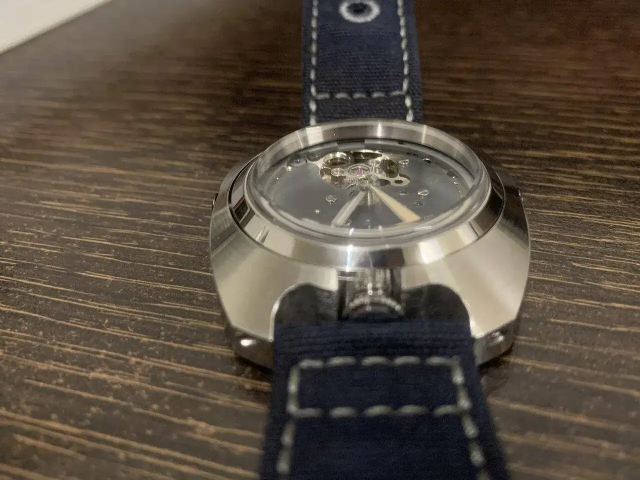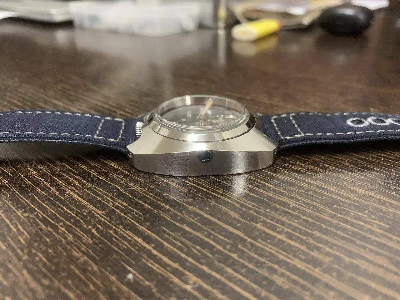 Hoy os presento el último prototipo que he hecho, se trata de un reloj con un módulo y una caja, separados y unidos por dos tornillos, para el módulo interior, aproveché un reloj Baltany con un NH38 y transformé la caja en circular, manteniendo la estanqueidad, al quitarle el dial, me pareció que tenía una esqueletización suficientemente digna como para mostrarla y lo único que le hice fue azular a fuego la pletina que se ve. Con el módulo listo (y con dos colisos para alojar los tornillos) construí la caja exterior de 0. Es de inox también, y buscando una estética de Bethune, salió algo hibrido entre lo que buscaba y una caja de diver vintage (más esta última que la estética de Bethune).