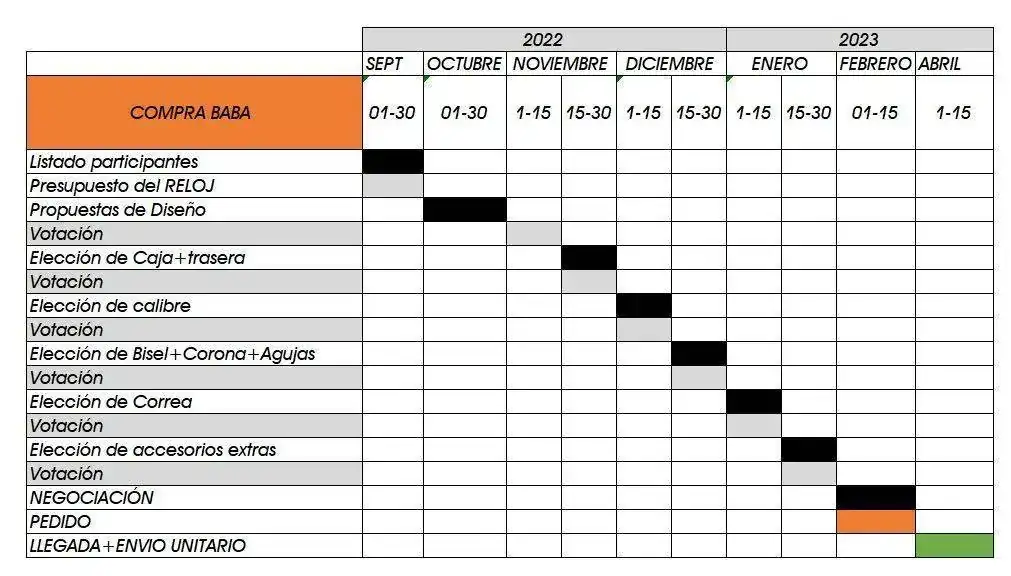 Todo dependerá de la cantidad de personas y el tipo de reloj que queramos, pero entiendo que el precio, rondará los 150-200€.Buenas tardes , como veo que alguno se está apuntando, he hecho esta pequeña tabla para ver que pasos debemos seguir y sus fechas.
