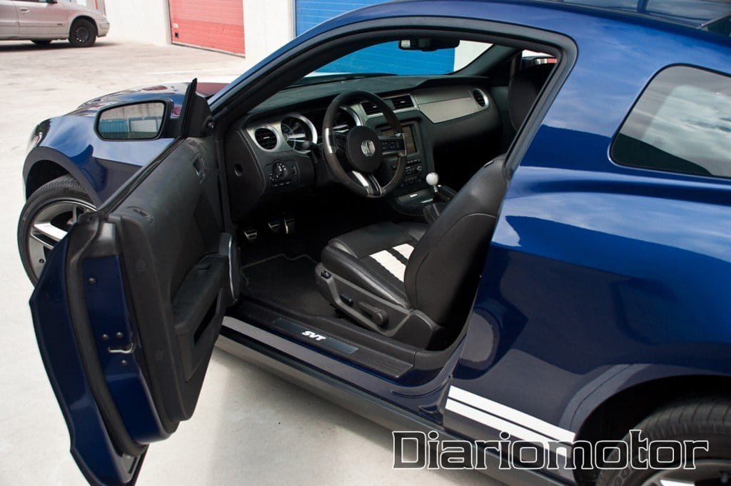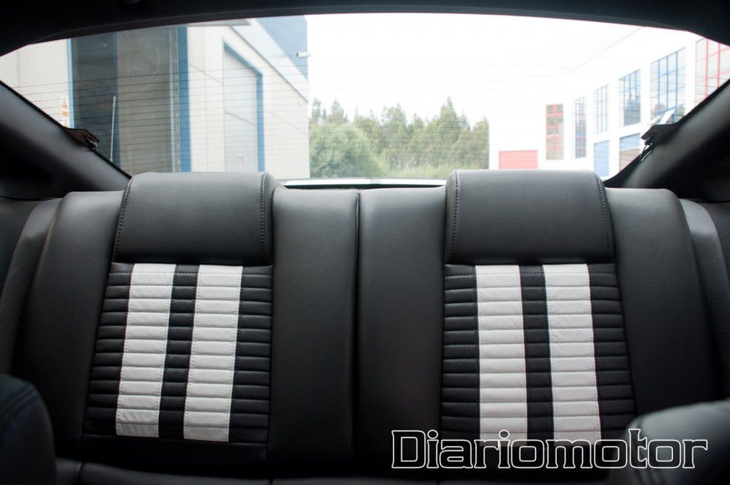 Antes de introducirnos en nuestra posición de conducción, en la parte inferior nos volvemos a encontrar con las iniciales SVT. Los asientos lucen cuero negro con rayas blancas a juego con el exterior en las cuatro plazas de las que dispone el coche. En el caso de los delanteros nos disponemos de operación eléctrica y unos laterales forrados en Alcantara que recogen de forma consistente e impiden que salgamos despedidos en las curvas de una manera. Las dos plazas posteriores disponen de un espacio suficiente para sentar a sendos adultos de forma relativamente cómoda, en pocos coches de esta potencia disponemos de esta comodidad.