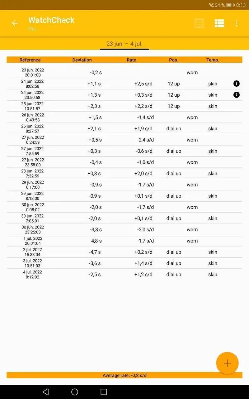 Cómo podéis ver, está en una media de -0,2 segundos día, las mediciones son orientativas (las hace uno mismo, por lo que hay margen de error), y prácticamente lo que me pierde por el día lo compensa por la noche. Lo he tenido sesenta horas descargándose y no ha experimentado una especial desviación estando con menos carga, como le pasa a todos mis automáticos.