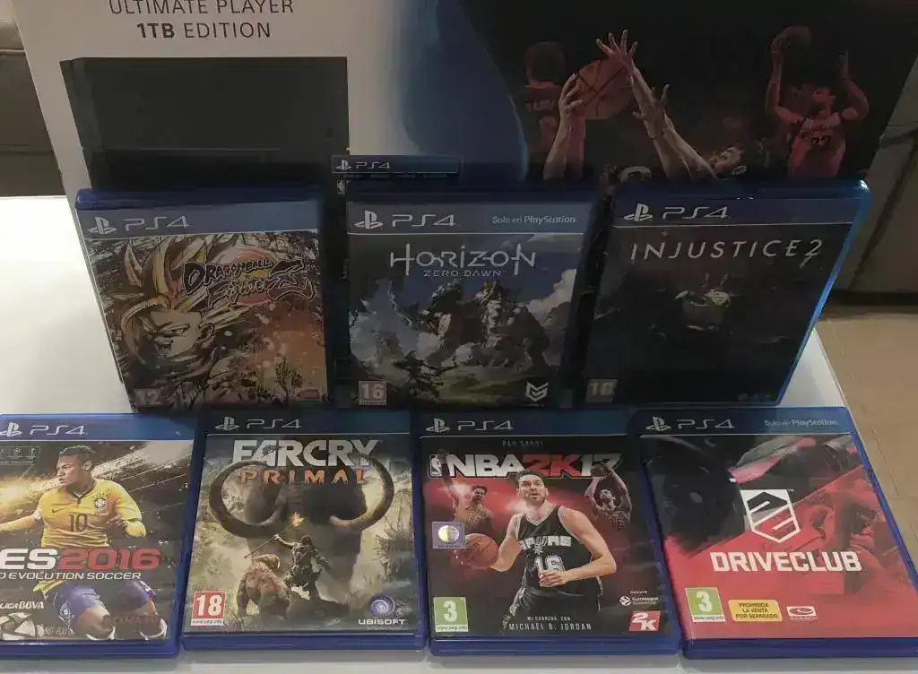 Vendo mi ps4 de 1tb de capacidad por falta de uso, con dos canijos en casa no saco tiempo para juegos ya. Tiene muy pocas horas de uso y un estado excelente.Es la de mayor capacidad de 1 tb, los juegos que incluyo son en estado físico todo completo con cajas e instrucciones y son los que pongo en La foto más abajo.
