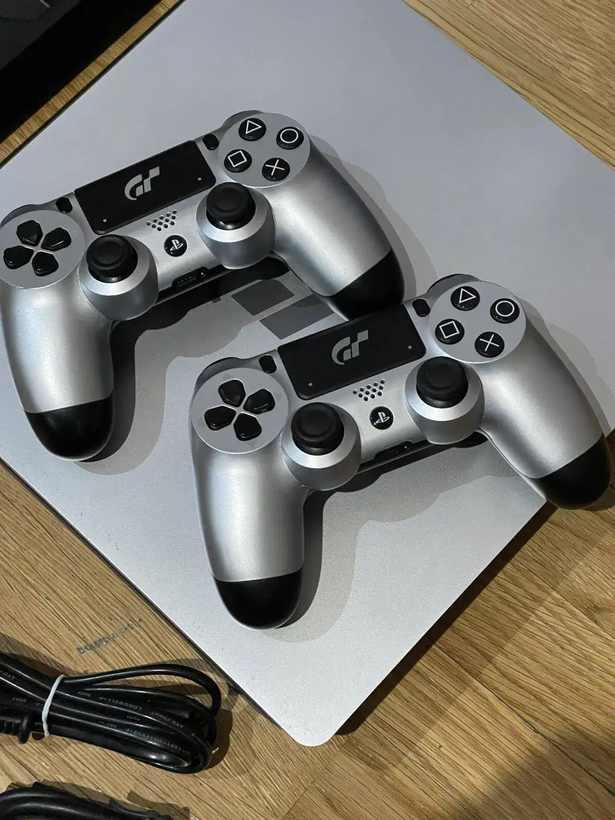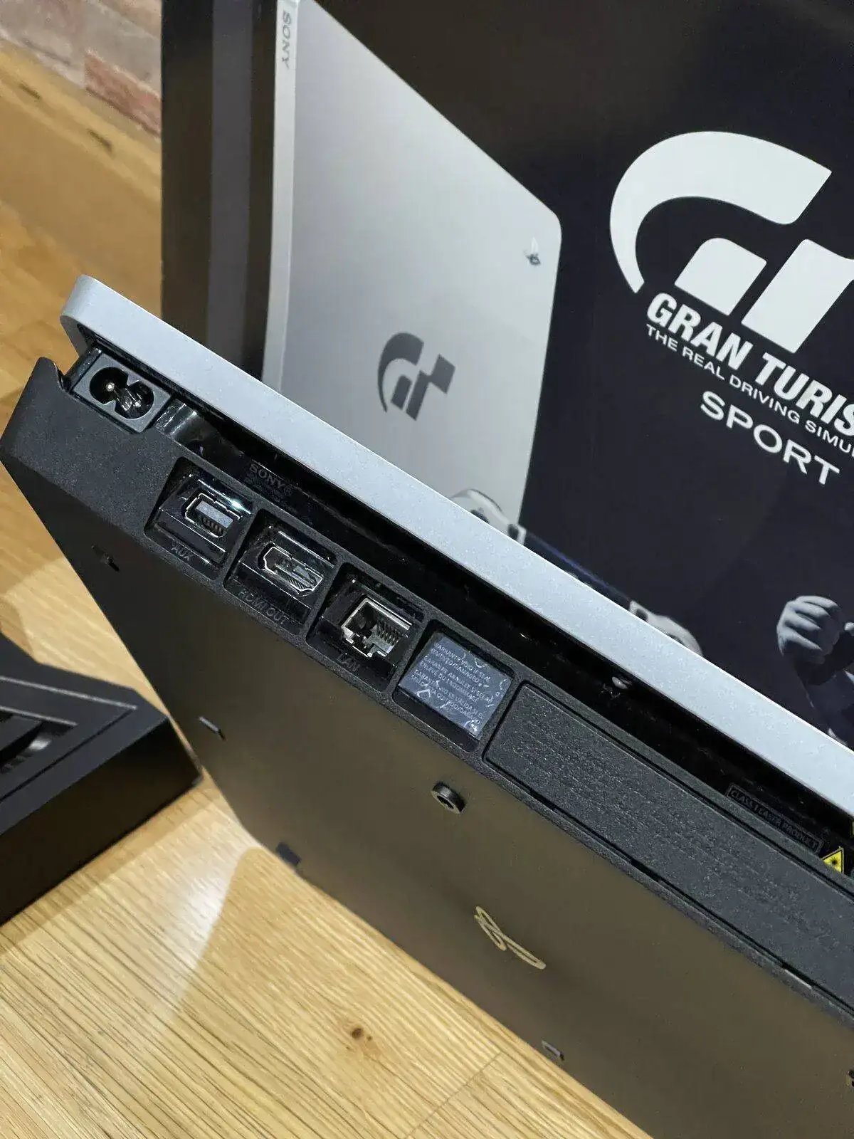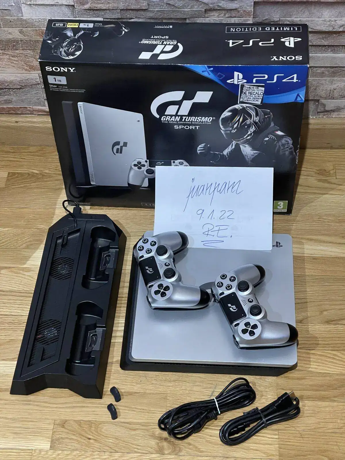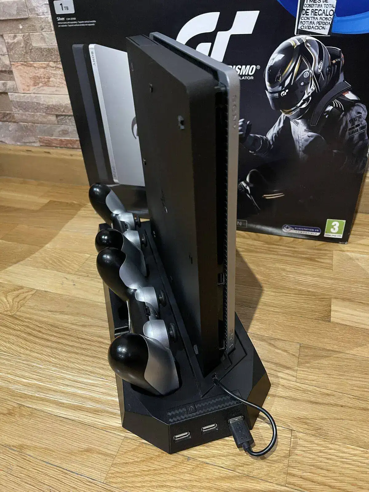 Por pasar a la PS5, saco a la venta consola Sony PlayStation 4 Slim GT Edition de 1TB de almacenamiento, con dos mandos, base refrigeradora, carga de los dos mansos mediante adaptadores adjuntos (fotos) y la opción de tener 3 puertos Usb adicionales a los que tras la consola. Adjunto también cables de corriente y hdmi, documentación y embalaje original (sin corchos).