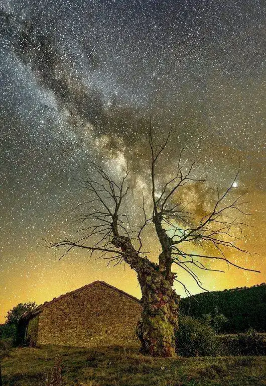 El cielo estrellado es para mi el gran protagonista que además se encuentra "arañado" por las ramas desnudas de hojas provocando un efecto casi hipnótico al espectador. Una imagen bucólica, con el árbol seco, la casa antigua, el paisaje vacío y el sol ya puesto que me produce desazón.