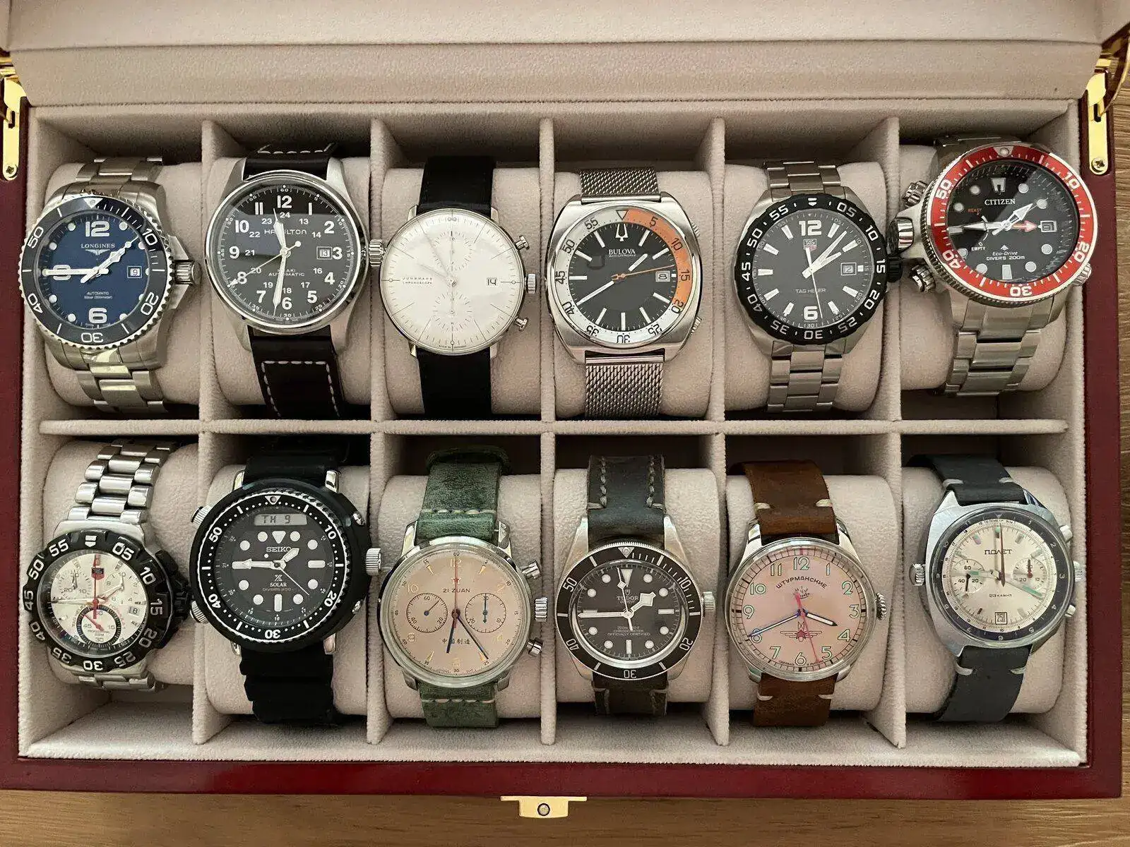 Pues me acabo de dar cuenta que he pasado los 1.000 y no he hecho la presentación de armas que mandan los cánones y las buenas costumbres. Así que por hoy os voy a mostrar lo que podría denominar mi "Caja 1", que es donde están los de rotación habitual, los que más me pongo, y que por una razón o otra, creo que van a estar siempre conmigo. Primero la foto general, y luego algún detalle breve de cada uno para no hacerme pesado. Además, creo que ya los habéis visto todos en los hilos diarios. Ahí va la caja:
