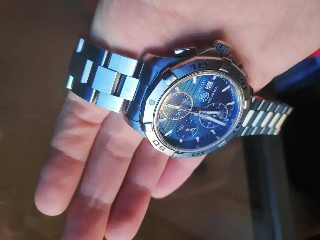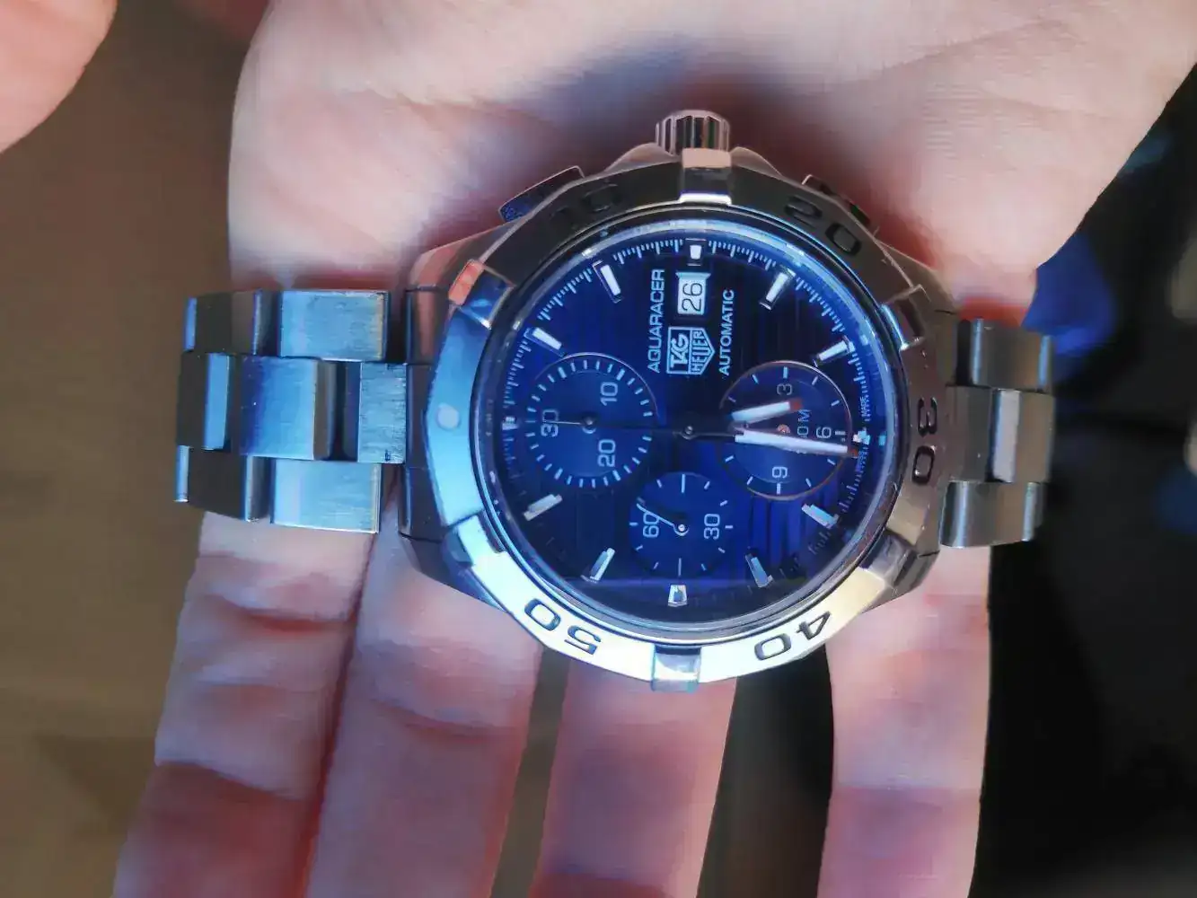 Llegados a este momento no sabía qué hacer, y de casualidad me fui con mi chica al Corte Inglés. Como la cabra tira al monte, pues ahí estábamos en el escaparte de Tag, viendo el Brad y ahí estaba él escondido como agazapándose sin querer ser visto, un fantástico Aquaracer crono precioso, se me caía la baba al verlo y ni corto ni perezoso le dije a la dependienta, por favor quiero probarme este modelo y… flechazo, ni me había llegado plantear este modelo. Si ya sé que un diver no puede ser un crono, que queréis que os diga…rarito que es uno. Vamos que el Brad Pitt se había quedado relegado por el aquaracer.
