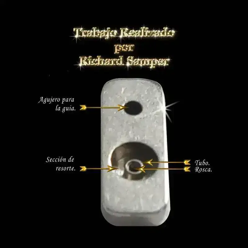 Esta es una estructura de acero inoxidable. En este encontrareis dos agujeros. Uno pequeño que sirve para la guía. Y encontramos otro hueco en el que podéis ver un tubo roscado. En la imagen de arriba os he descrito “sección del resorte” y seguido un tubo roscado. La sección del resorte es el espacio donde entra el resorte, y el tubo entra en el agujero del resorte. La rosca en un agujero roscado donde enrosca el tornillo. Os invito a ver la imagen sub siguiente.