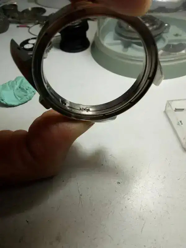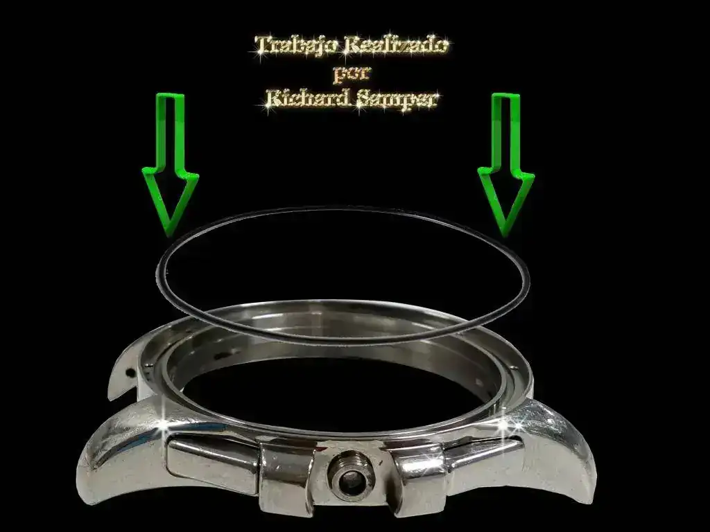 Por favor os ruego, este paso es verdaderamente importante; si no lo hacéis bien el reloj quedará susceptible a la filtración de humedad. Si observad, la caja tiene una zanja en la cual descasa el empaque ú o-ring. Ahora veréis la imagen sub siguiente.