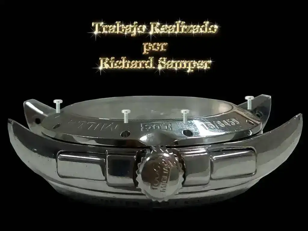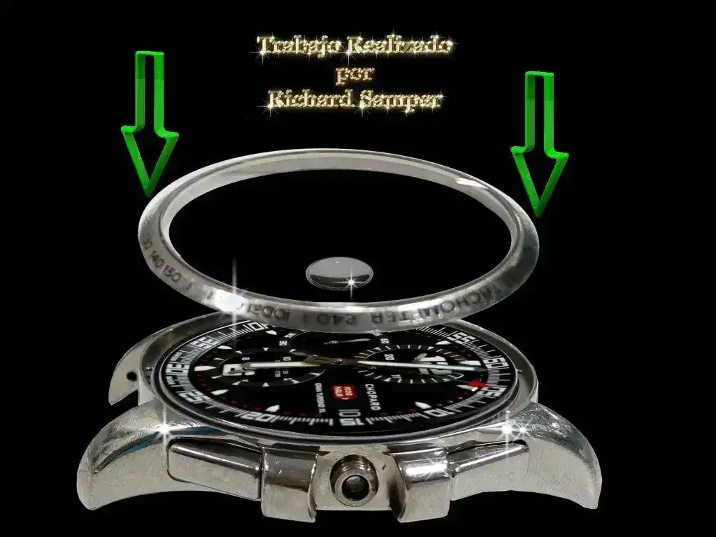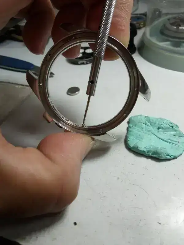 Debéis tener cuidado de que el tres de la esfera quede donde va la corona, puesto que la corona por medio de la tija entra en un agujero que va dentro del movimiento. Haced esta parte con extremo cuidado. Paso seguido instalemos el aro.