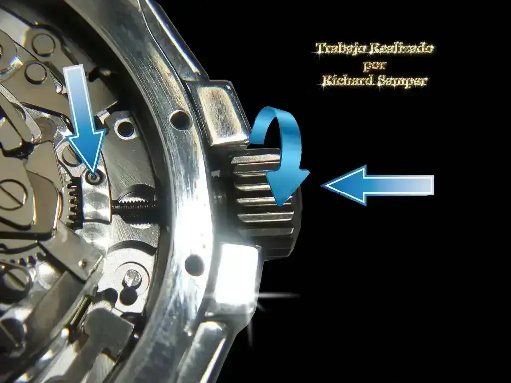 Metéis la tija y aplicad una leve presión sobre el punto que os indico con la flecha y empujamos con cuidado y haciendo un suave movimiento giratorio a la corona. Esto lo hacéis simultáneamente. Suele en algunas situaciones que cuando la tija no está limpia o sin lubricación; el sistema remontuar o sistema de puesta en hora se rembersa; es decir se traba. Si lo hacéis como os he descrito, os aseguro que no tendréis ningún problema.