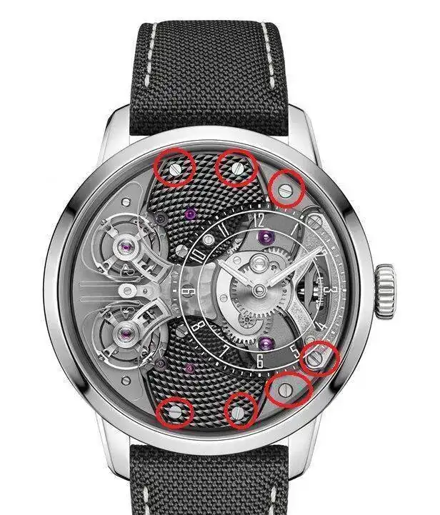 En cuanto a las decoraciones hechas a mano en el Pure Resonance Ultimate Sapphire, los puentes de la rueda de engranajes con tratamiento PVD negro están adornados con un patrón de grano de cebada guilloché realizado por el taller de Kari Voutilainen, mientras que todas las demás decoraciones son hechas internamente por Armin Strom. Los bordes son biselados a mano, los puentes de los volantes están esqueletizados y presentan un acabado circular, otros puentes están pulidos a mano, esmerilados, pulidos a espejo o perlados. Como colofón, la textura granulada en el puente de cuerda a la derecha: un ejemplo de tremblage logrado por uno de los maestros grabadores de Armin Strom, que se pasó horas esculpiendo cuidadosa y minuciosamente un patrón "frosted" con una herramienta fabricada por él mismo.