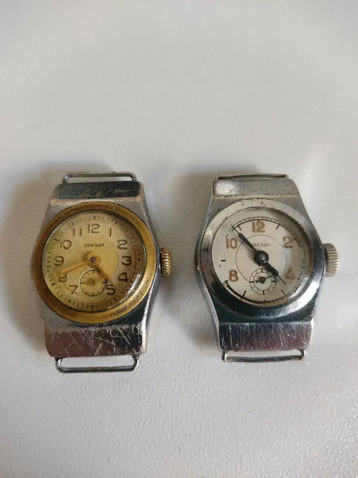Bien!!Pues ya llegó, y para mi sorpresa viene con una hermanita, ya me dijo el ukranianiano que venía con regalo pero no me esperaba otro reloj. El de 99 céntimos funciona como un campeón y gratis no, le doy cuerda y cuando suelto la corona empieza a dar vueltas en sentido contrario, pero como dicen a caballo regalado no le mires el diente.Acabo de comprar mi primer vintage, un Zvezda de señora por la increíble cantidad de 0.99 euros, puje hace unos días sin mucha convicción y sorpresa, gane la subasta, yo no entiendo nada de vintage ni siquiera se que modelo es exactamente. Me gusta mucho su calibre y ahora viendo las fotos con más detenimiento veo que tiene una pequeña sección del dial borrado.Ver el archivos adjunto 941035 Ver el archivos adjunto 941037
