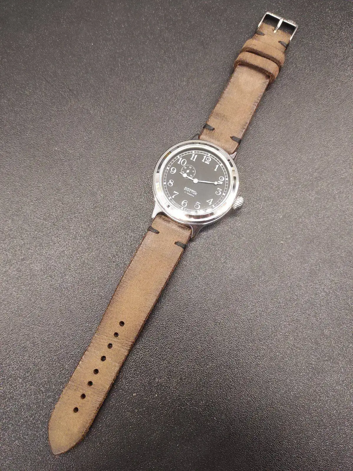 Y para acrecentar su apariencia vintage, le he cambiado la correa por esta artesana, que he hecho durante el mes de espera!