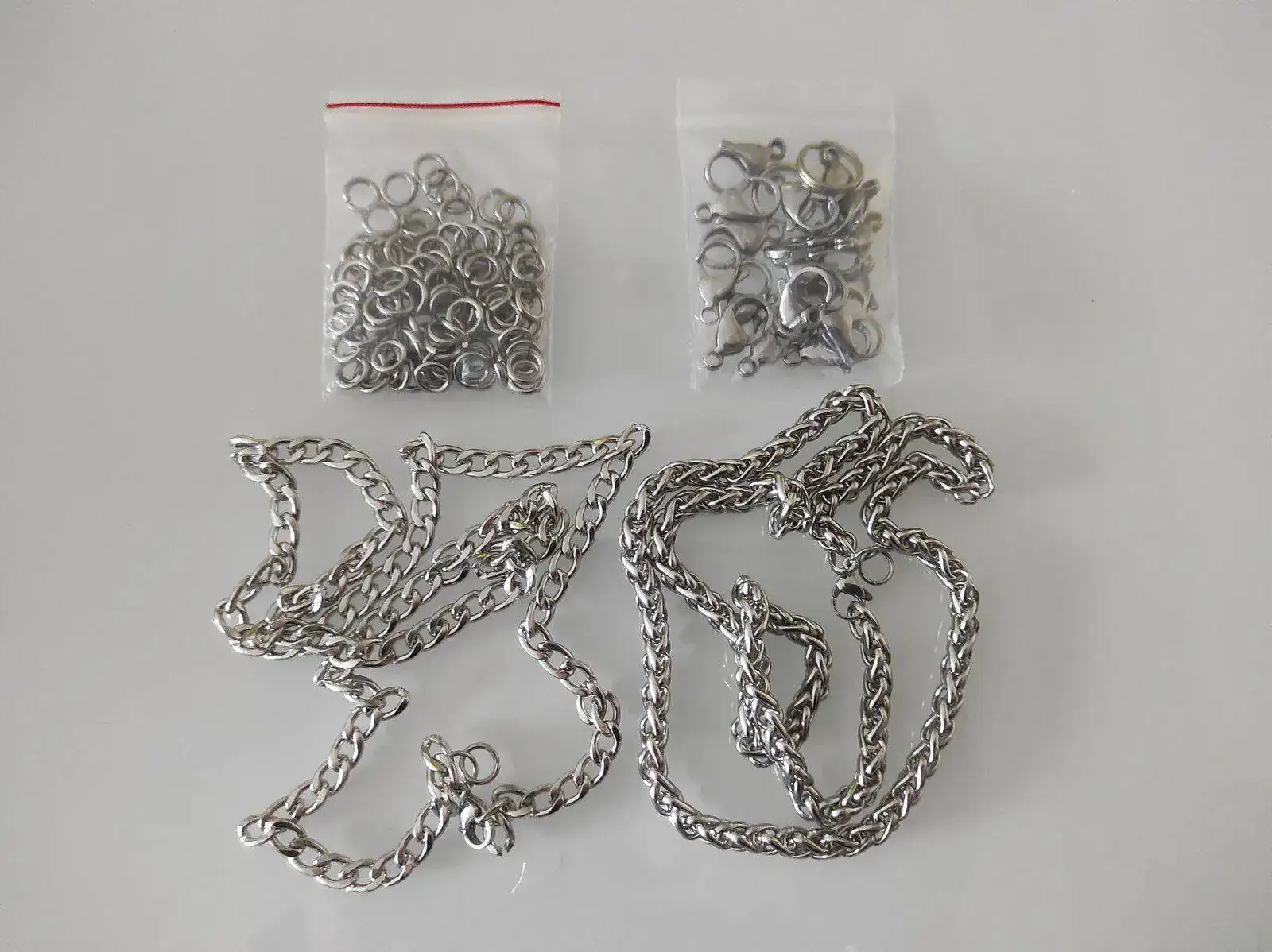 Son collares de Aliexpress de acero inoxidable, los he comprado de 1m y salen tres leontinas de cada uno. Los accesorios son también inox.