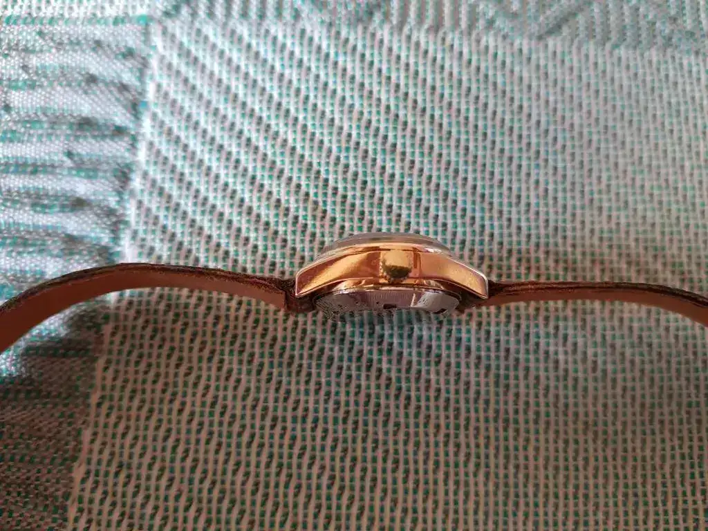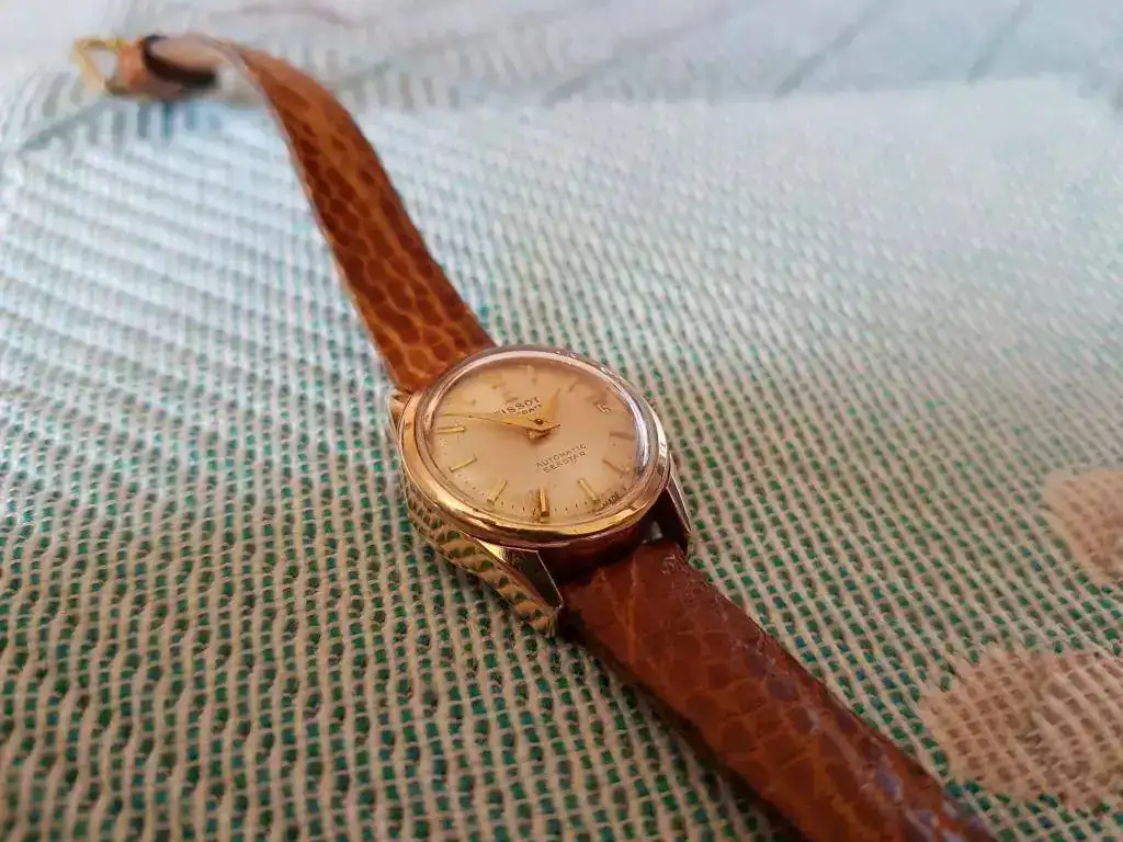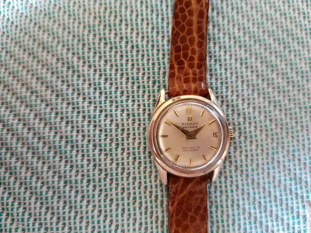 Aquí les pongo unas fotos de un relojito Tissot Visodate, que no tengo la menor idea de que año pudiera ser. Es automático de 21 joyas y funciona muy bién. Perteneció a la abuela de mi esposa y se lo acaban de dar. Pienso que pudiera ser de oro o al menos chapado, ya que aunque llevaba mucho tiempo guardado, no cambió de color ni perdió brillo. En ninguna esquina se nota que haya salido el metal de abajo.