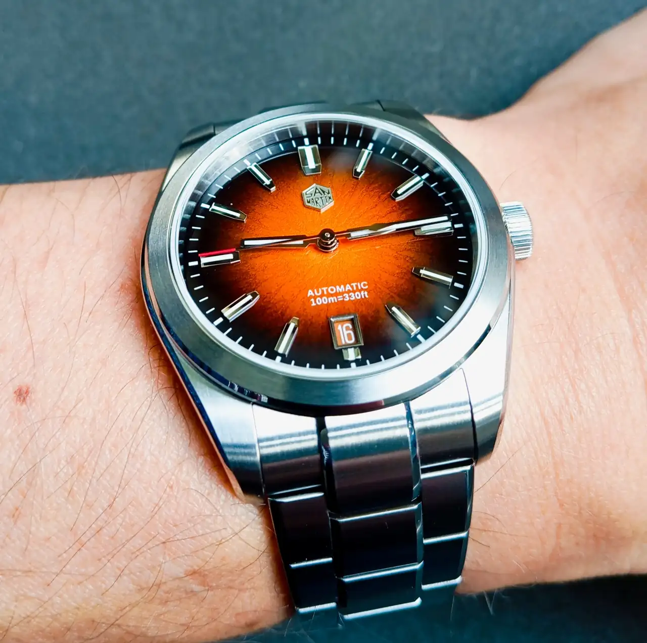Tiene una pinta espectacular y lo están poniendo por las nubes. Ya nos contarás qué tal.Pues este acaba de caer. Será mi primer San Martín. Quiero comprobar de primera mano las calidades que a veces se mencionan sobre la marca. Desde el almacén europeo con descuento me ha quedado en 300 euros. Para las especificaciones que marca lo veo un precio más que correcto. Lleva Miyota 9015 y sus características sobre el papel no las encuentro en otro reloj. Además, tiene la suficiente personalidad bajo mi punto de vista (bagaje estético) para descargarme de mis muchos prejuicios sobre fusiladas. Ya os cuento cuando lo reciba.