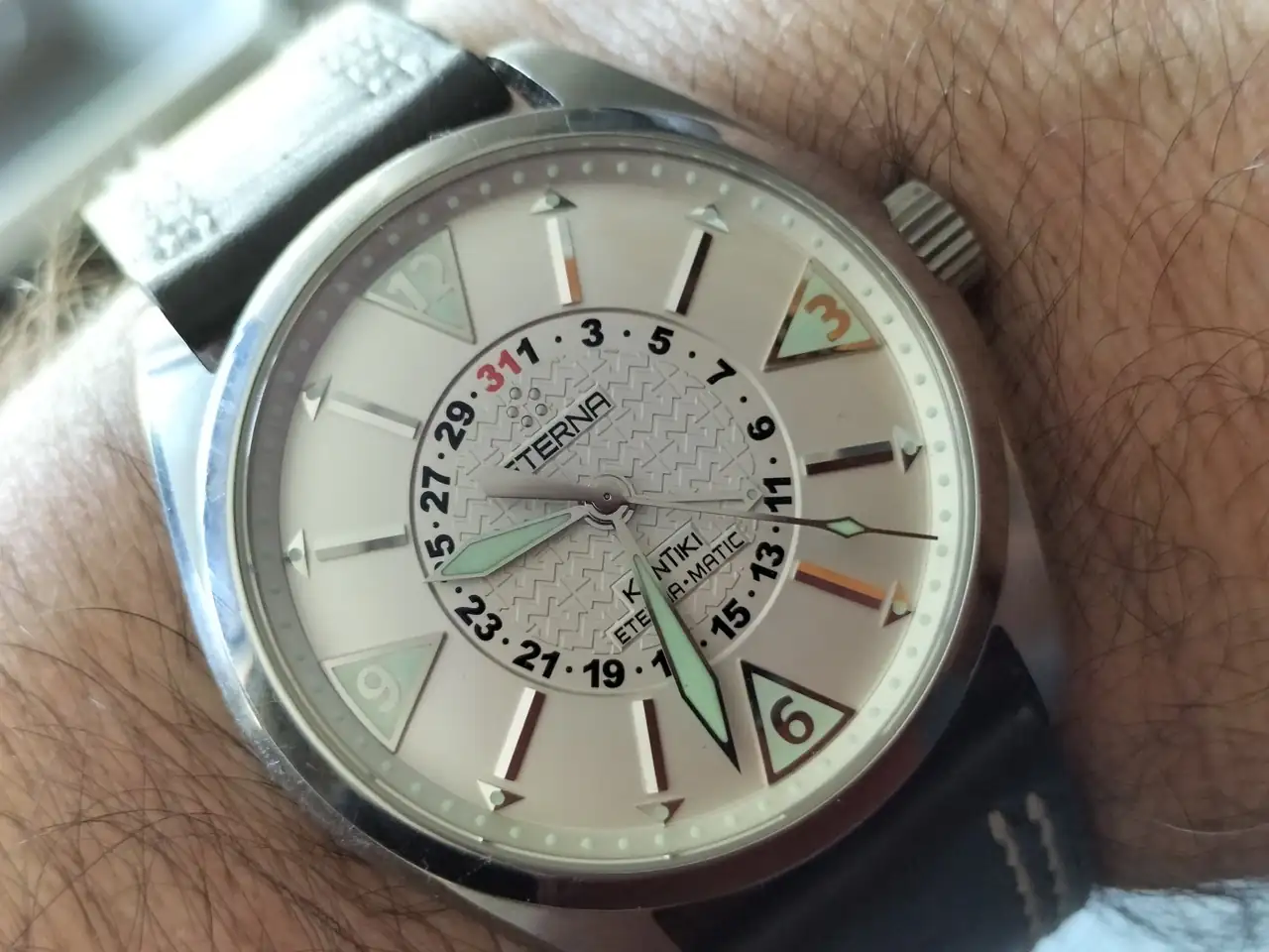 Hola amigos, he visto este reloj, de la marca ETERNA, y quisiera conocer vuestras opiniones. Lleva calibre ETA 2836-2, no sé el resultado del mismo, en cuanto a fiabilidad y duración sin averías. Os adjunto una foto.