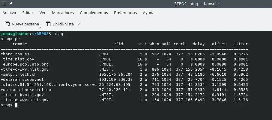 El resto de servidores (vemos entre ellos los del Instituto de Estándares y Tecnología de USA y el servicio horario europeo, una mezcla de servidores gubernamentales, universidades y voluntarios privados) también se utilizan para promediar la calidad entre todos ellos y saber a cuál elegir (con un + los servidores que se están usando para promediar; con un - los que están en reserva).