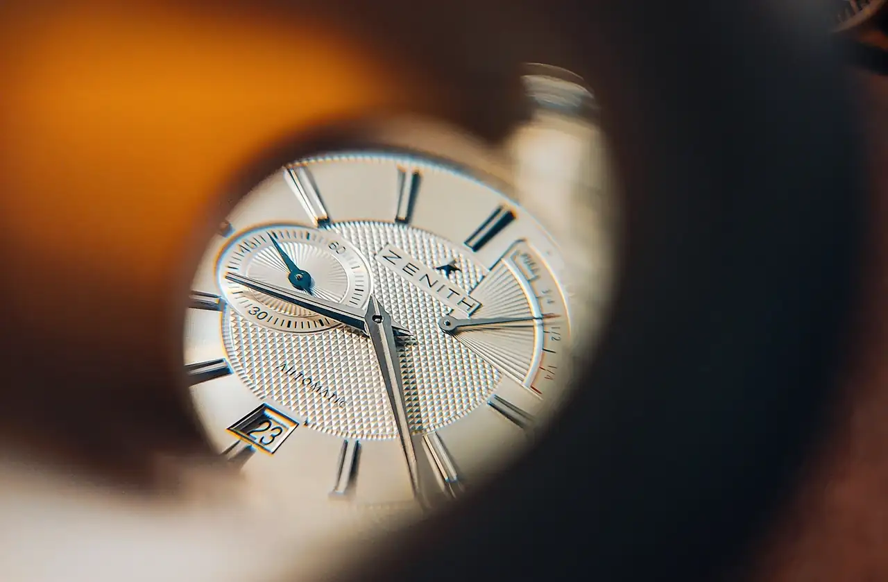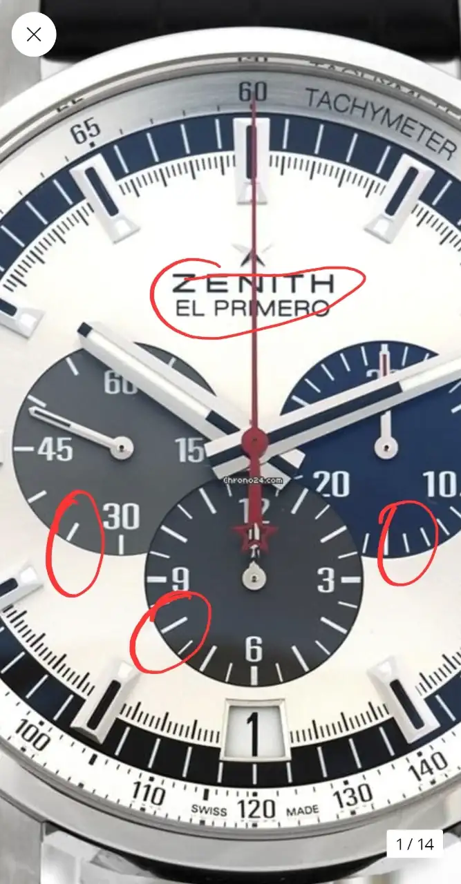 Esta no lleva el texto rojo 36000 VpH, pero no tiene los rebordes de definición en las esferas y diria que la textura de la esfera no es la misma ni la finura de las letras Zenith el Primero.
