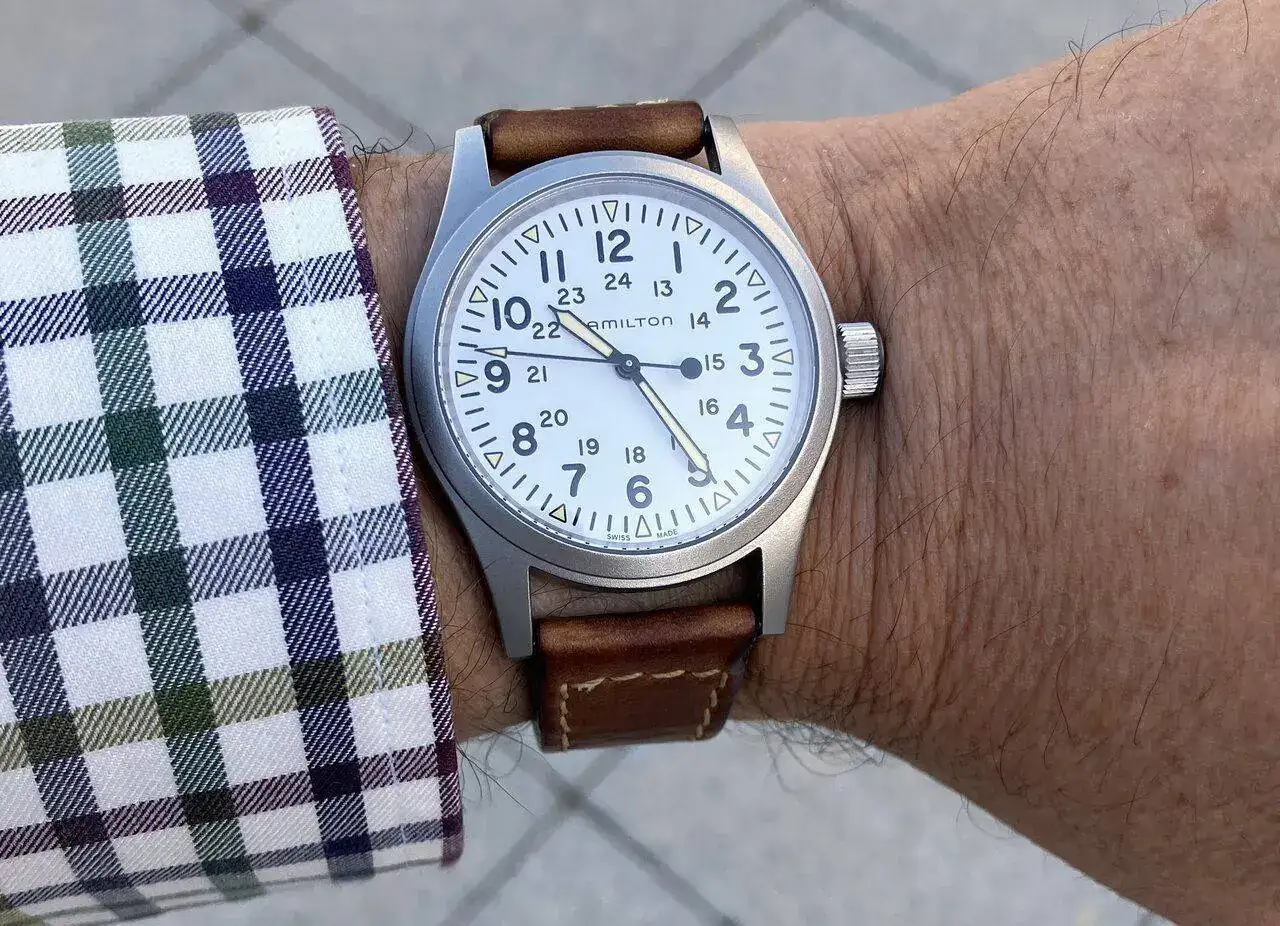 Me gusta tener mi primer reloj de cuerda, pero lo que más me gusta es que los reflejos en el cristal se noten mucho menos que en el Khaki Field negro.